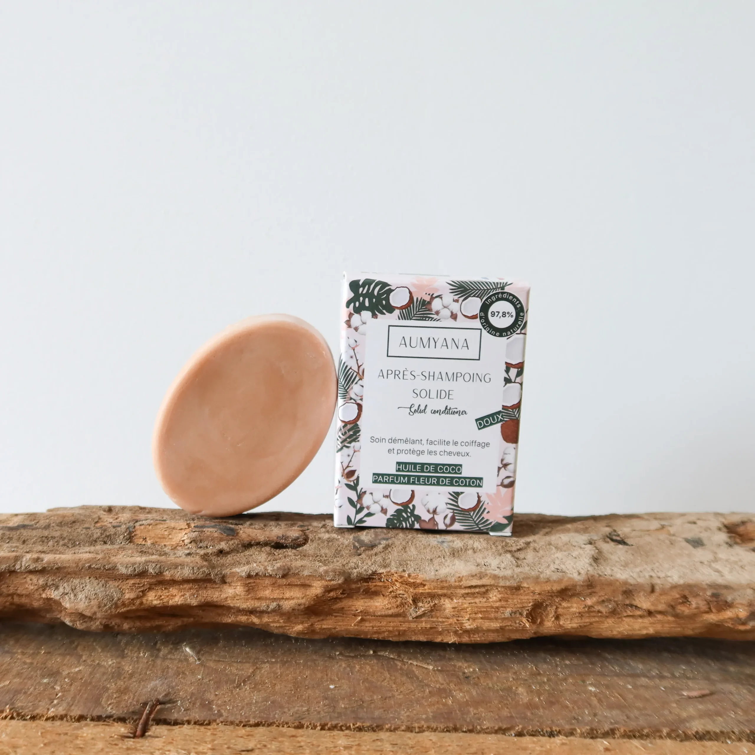 Après-shampoing solide efficace et agréable à utiliser. Pour des cheveux doux et démêlés. Pour tous types de cheveux, longs ou courts.