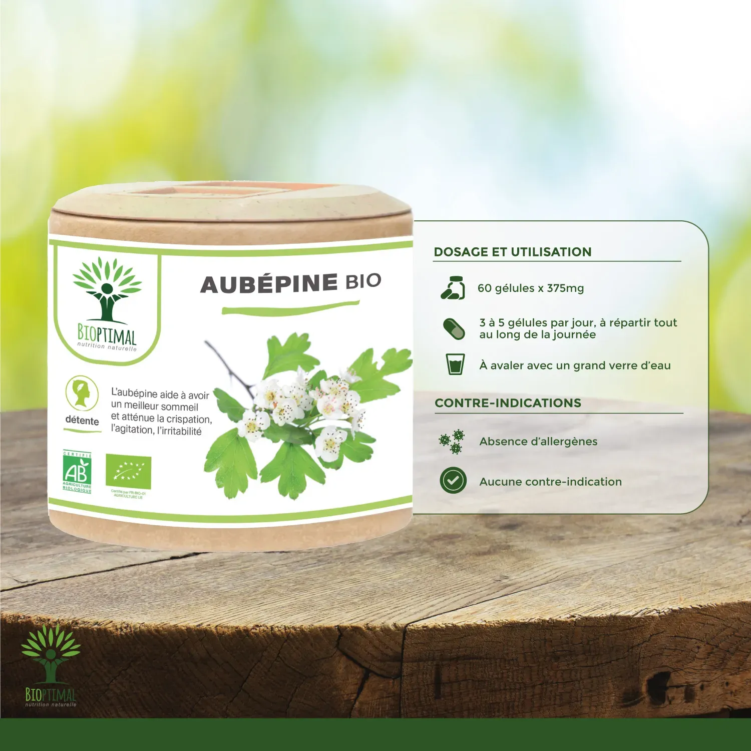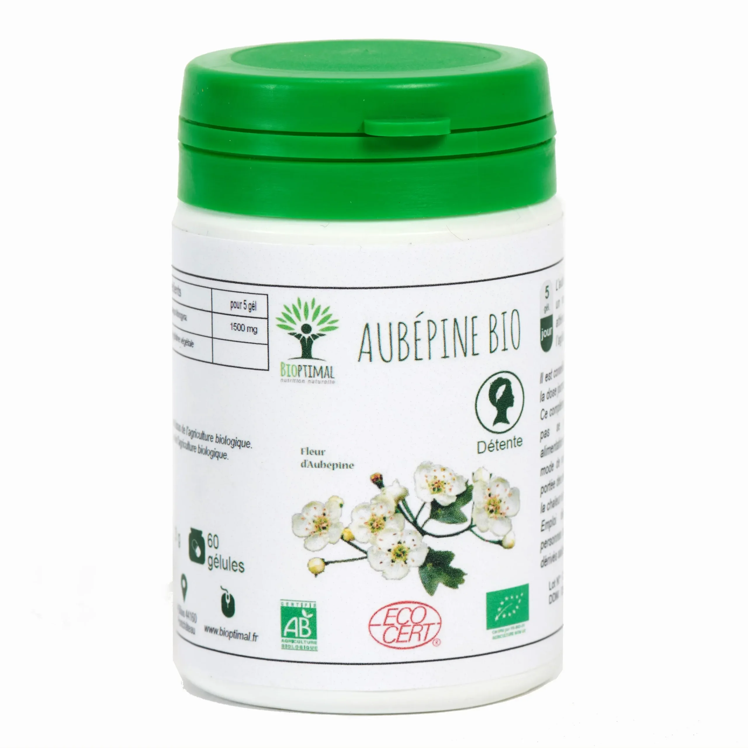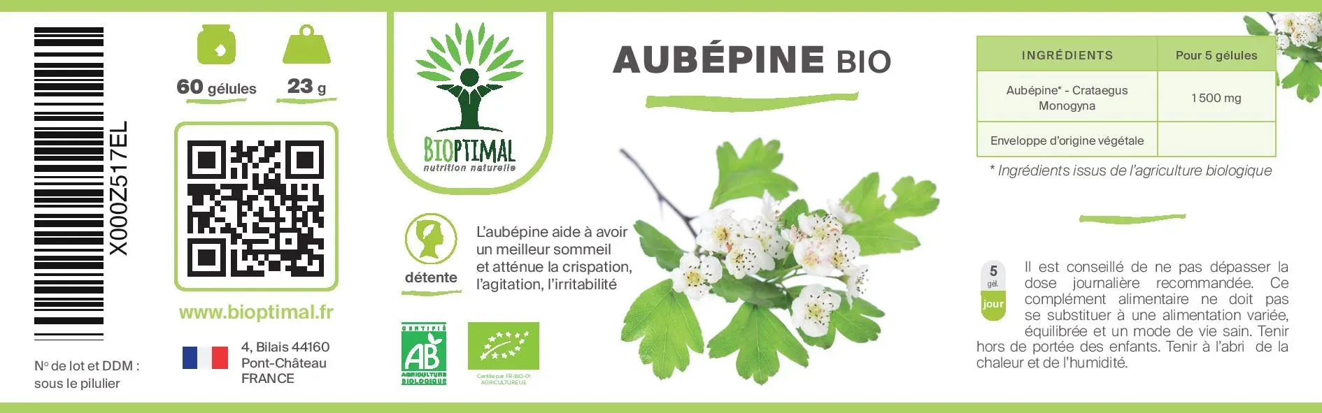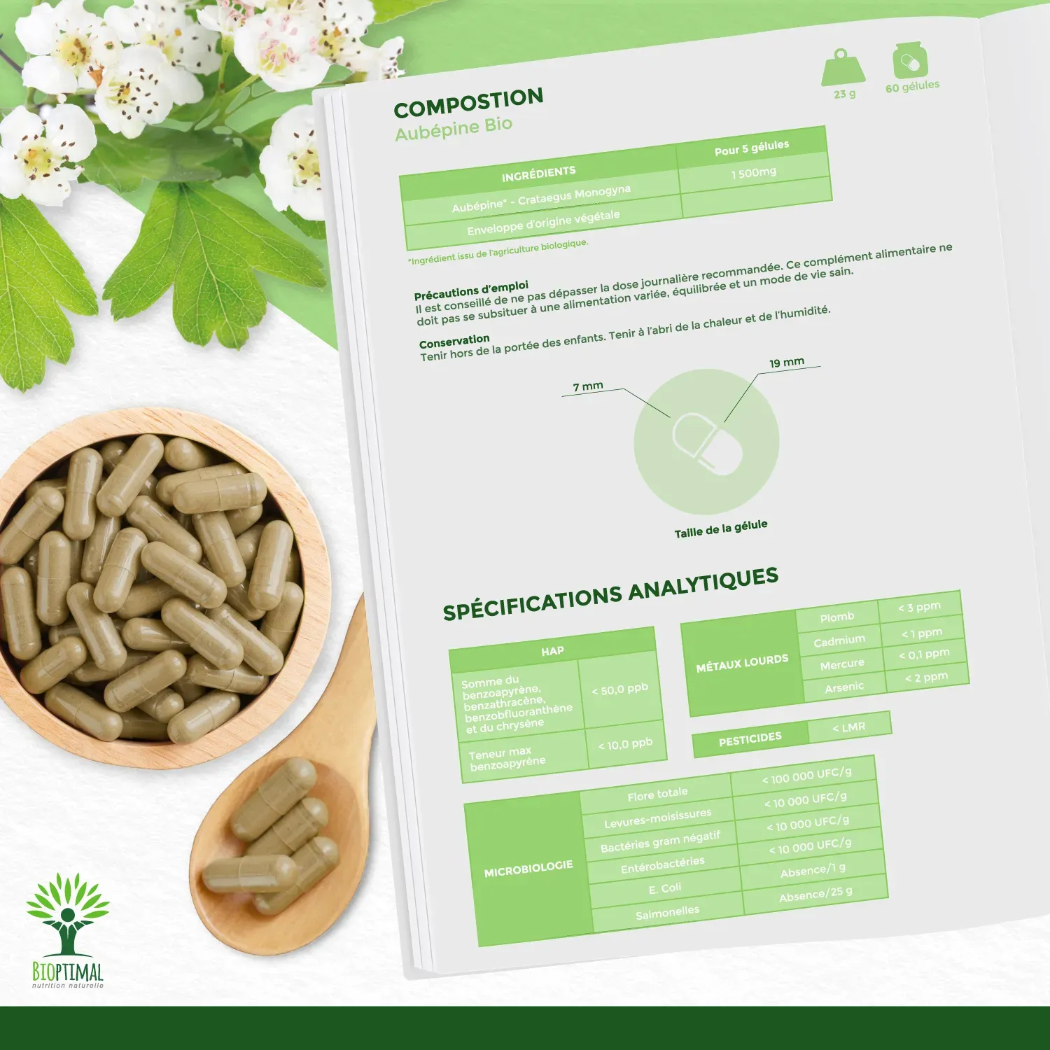Ingrédients, Fleurs d’aubépine biologiques en poudre de qualité supérieure. Garantie sans additif. Nous avons choisi de vous proposer un format gélule végétale plus efficace que le thé, tisane ou infusion, car pas d’apport liquide avant de se coucher, et plus simple à intégrer à votre alimentation avec une assimilation plus rapide. Dosage 300mg / capsule. Dose recommandée. 1 boîte de 60 gélules = 1 cure 1/2 mois – 150 jours. Facile à avaler. Issu de l’Agriculture Biologique garanti par Ecocert. Adapté aux végétariens et au régime vegan. Fabrication Française en Bretagne. Emballage recyclable et biodégradable. Attention aux produits concurrent qui sont souvent ajoutés à du dextrose ou du stéarate pour est compacté en comprimé.
