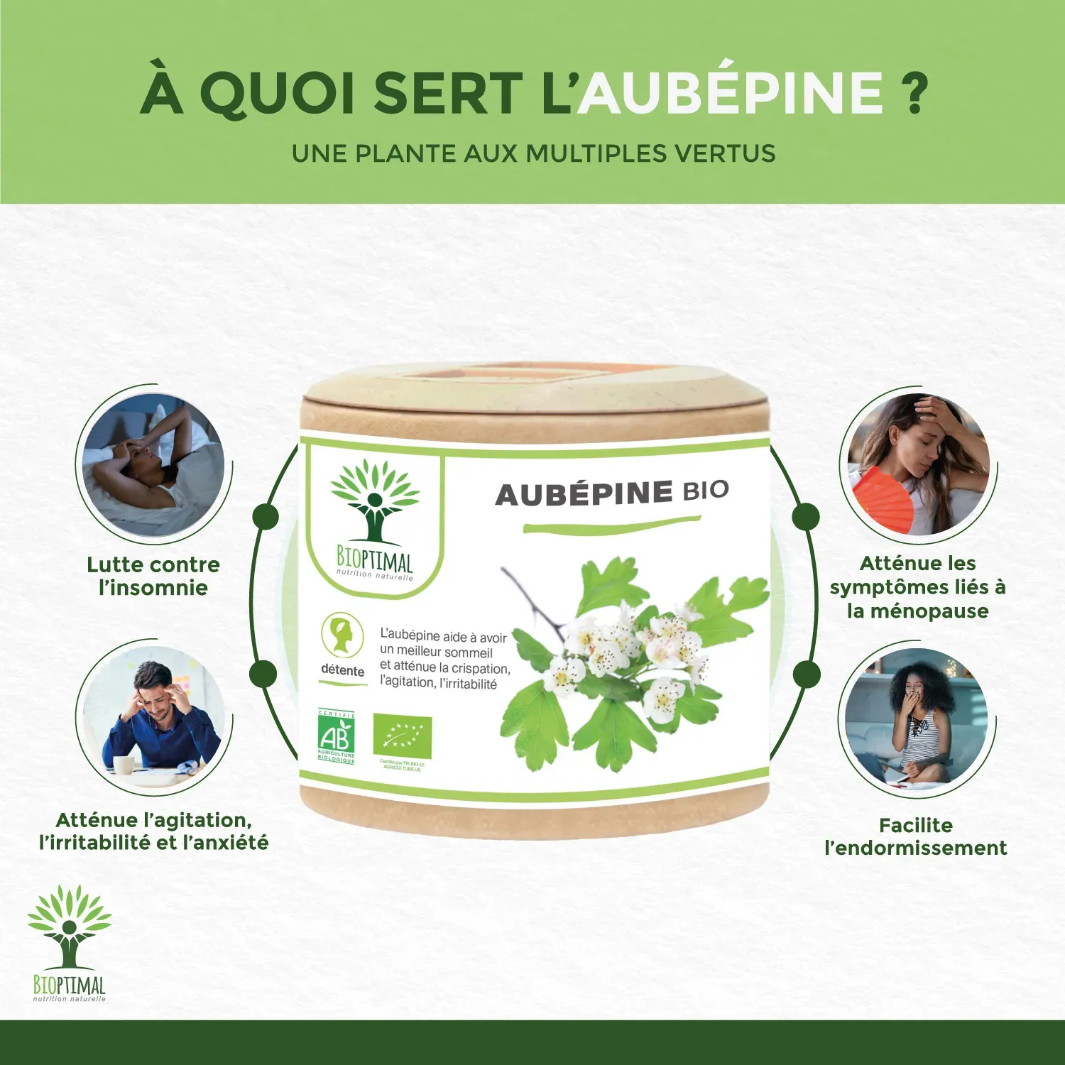 ✌😎 DIMINUE STRESS ET ANXIÉTÉ : Les fleurs d’aubépines atténuent la crispation, l’agitation et l’irritabilité. En effet, leurs substances actives ont montré une action de régulation sur la pression sanguine et sur la diminution de l’excitabilité du système nerveux. L’aubépine est un régulateur cardiaque ce qui aide à faire baisser les palpitations. On la recommande aussi contre les troubles liés à la ménopause (bouffées de chaleur, insomnie, etc…)