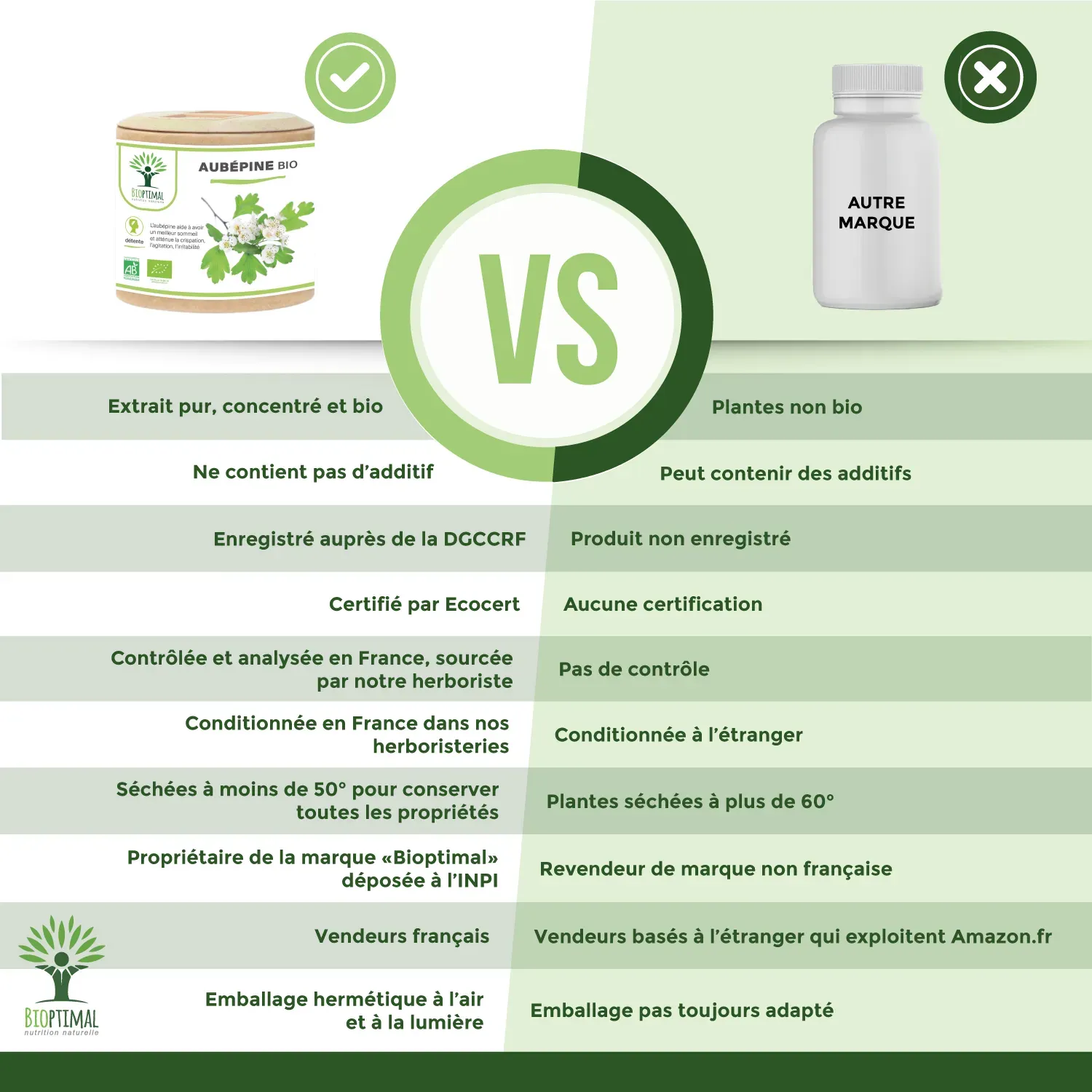 ⭐🔍 QUALITÉ FRANÇAISE = SECURITÉ : Nous fabriquons nos compléments alimentaires en France, nous avons fait le choix d’encapsuler notre aubépine bio en gélules végétales et non en comprimés pour ne pas intégrer de substances controversées tel que le talc, le stéarate ou carbonate de magnésium. Nos produits sont garantis sans additifs, ni agent de charge, ni ogm, ni pesticides, ni gluten, ils sont contrôlés en laboratoire en France et certifiés agriculture biologique, HACCP + et Afnor.