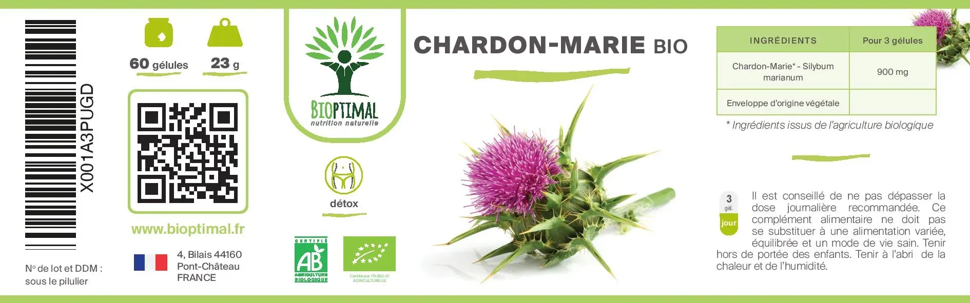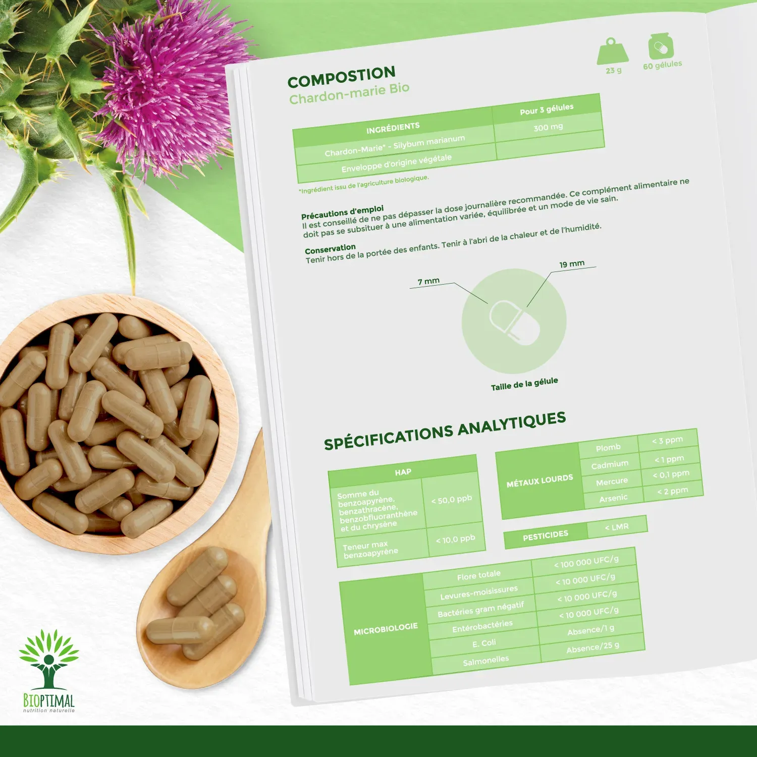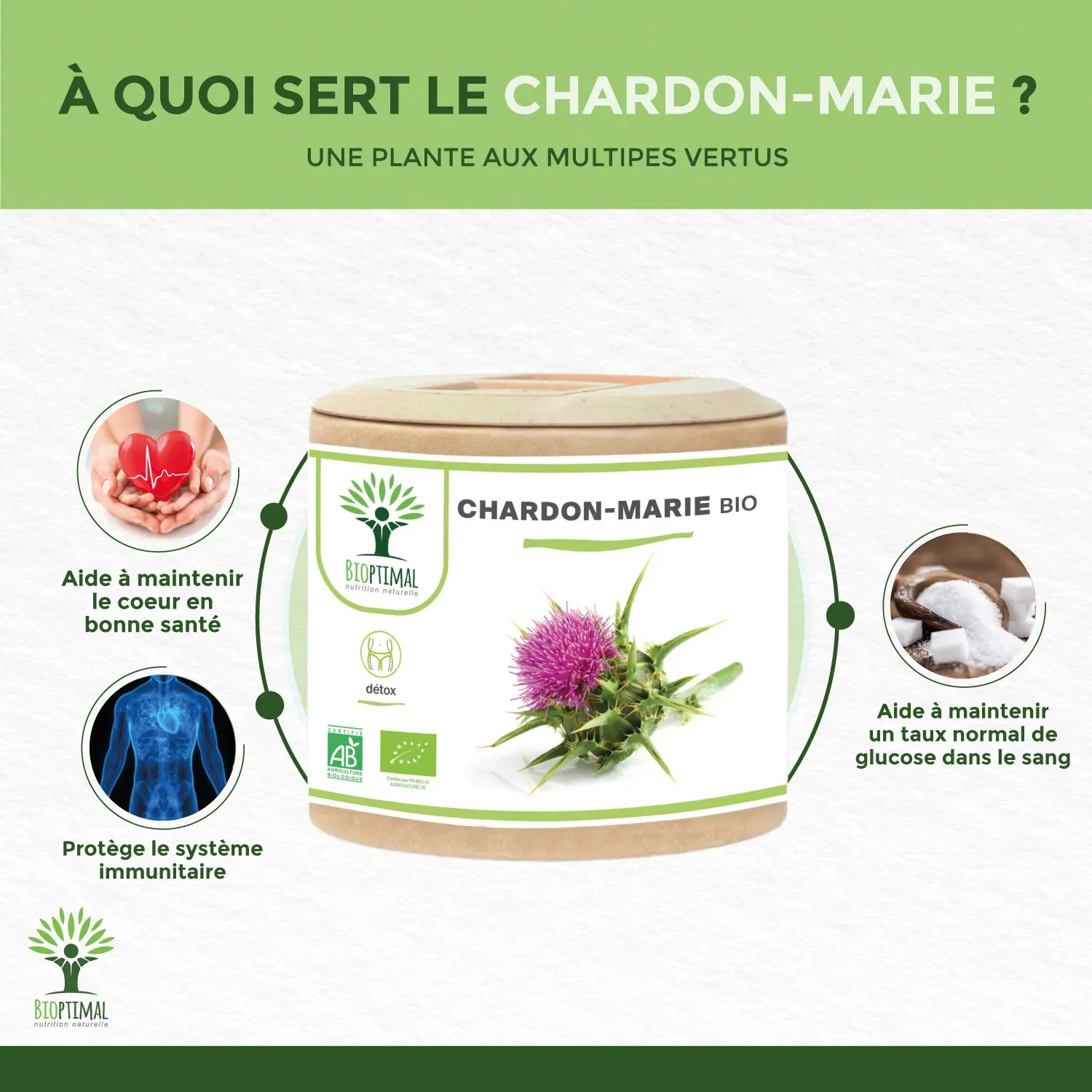 Notre produit Bioptimal nutrition naturelle : Ingrédients, uniquement graines de chardon Marie biologiques en poudre de qualité premium. Origine France. Nous avons choisi de vous proposer un format en gélule végétale plus efficace que le comprimé, l’huile, l’ampoule, thé, tisane ou infusion et plus simple à intégrer à votre alimentation. Adaptée au régime vegan. Boîte de 60 gélules soit une cure de 20 jours. Avaler avec un grand verre d’eau. Nos compléments alimentaires en association possible : Gélules de radis noir pour une action ciblé sur le foie.