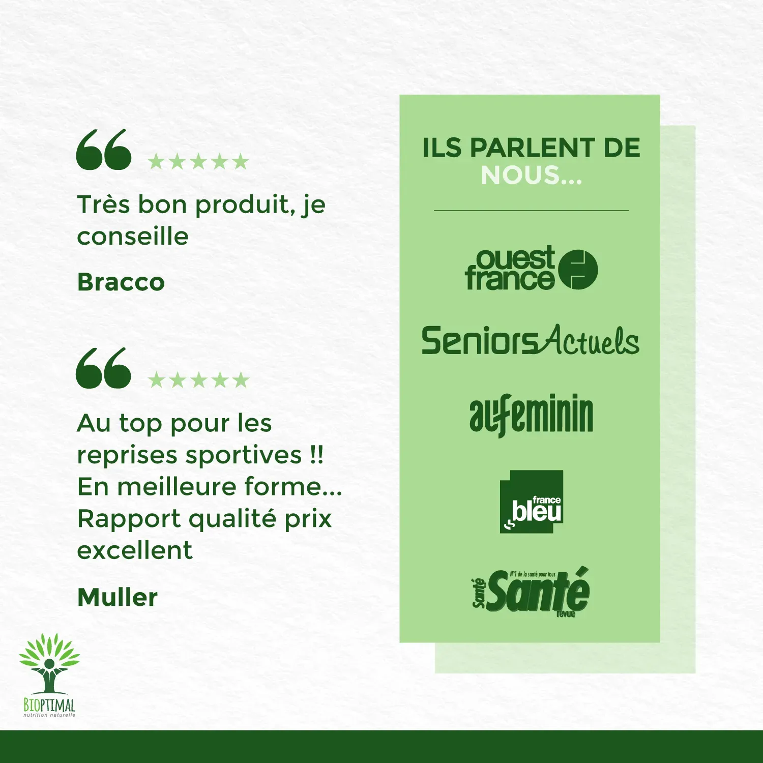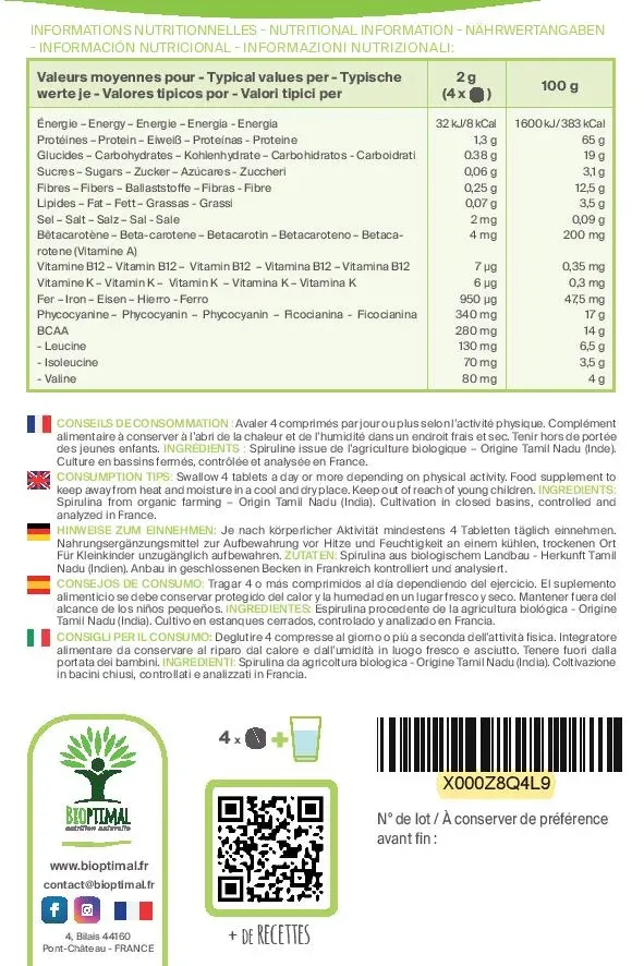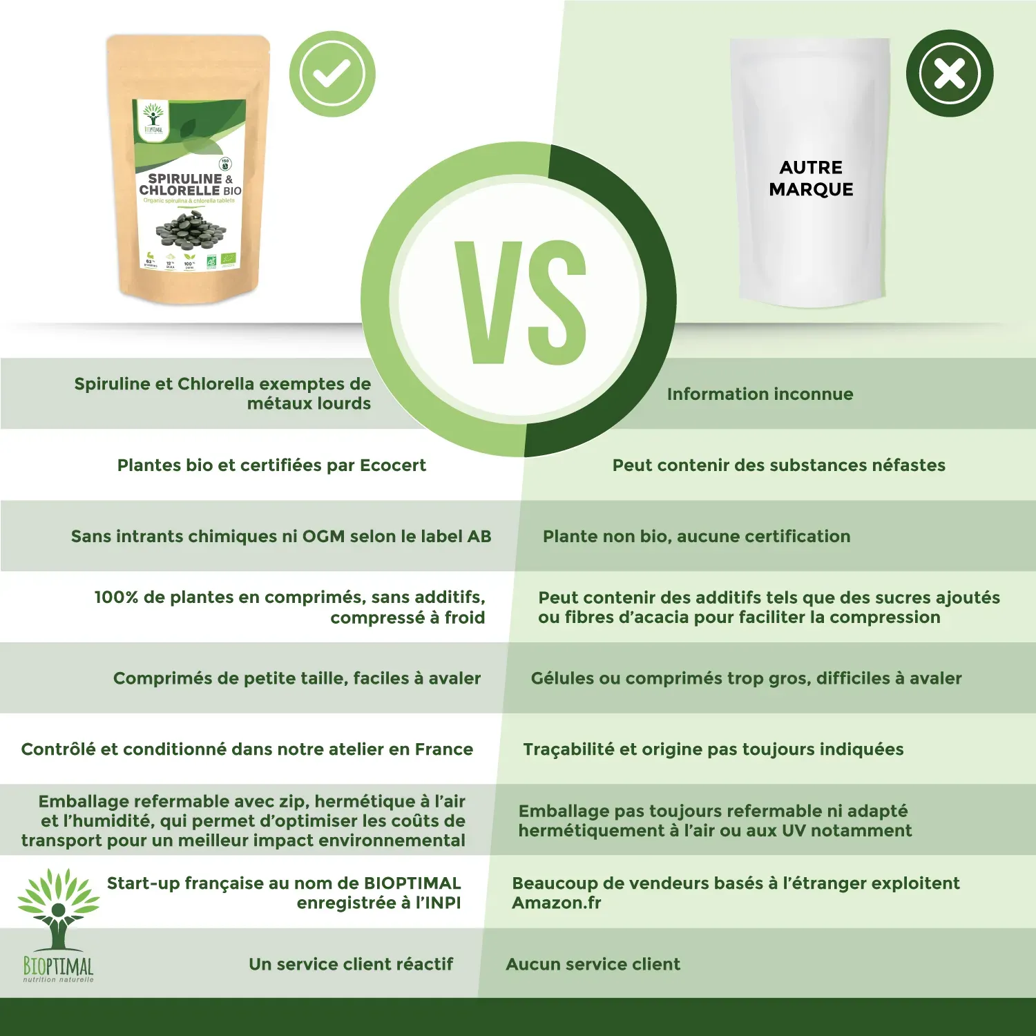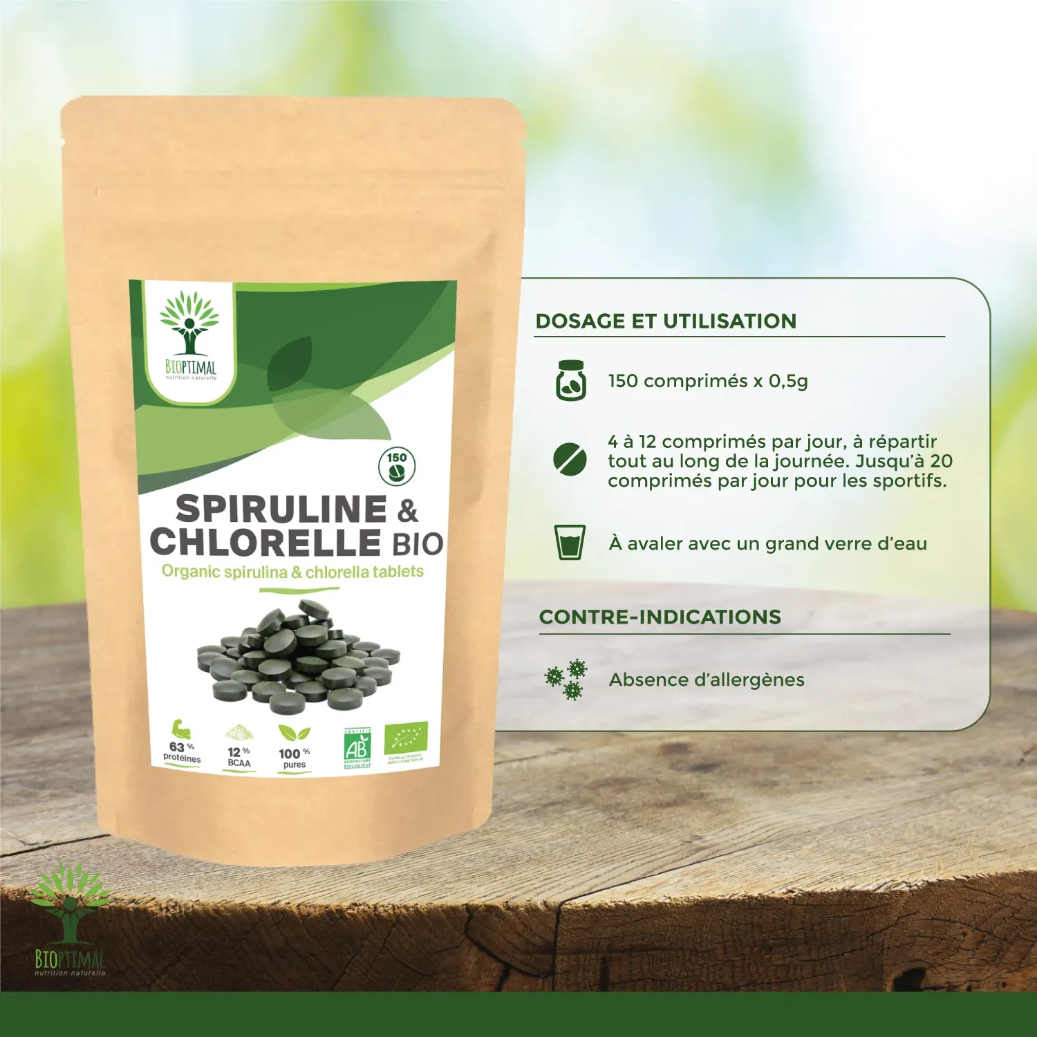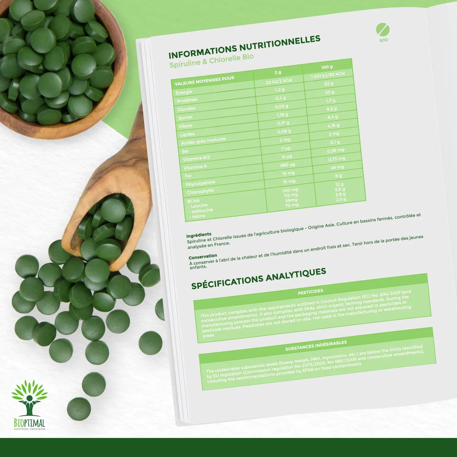 Notre produit Bioptimal nutrition naturelle : Ingrédients, 50% de poudre de chlorelle bio (chlorella vulgaris) et 50% de poudre spiruline bio (spirulina platensis) de qualité supérieure . Nous avons choisi de vous proposer un format en comprimé, pour une utilisation simplifiée à intégrer dans votre alimentation. Compressée à froid . Sans excipient en comparaison aux gélules. Dose recommandée 4 cp / jour. Traitement conseillé de 30 jours. 150 comprimés, 75 g = 5 semaines de cure. Emballage refermable.