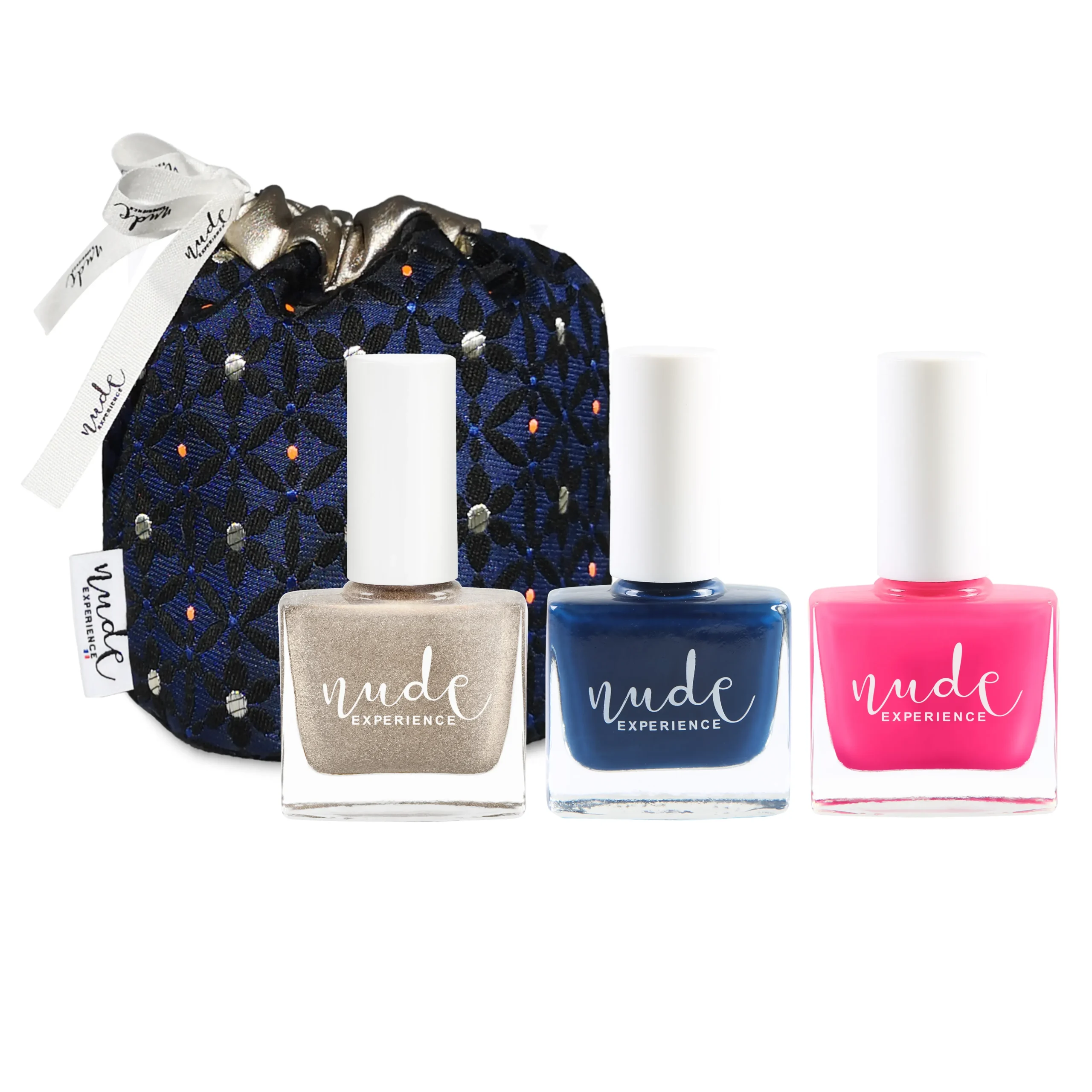 Vous recherchez le cadeau idéal à offrir ou simplement un petit cadeau à vous faire? Idéal pour emporter vos cosmétiques dans toutes vos aventures. Ce petit pochon et ses vernis vont faire des heureuses! Ce coffret contient 1 POCHON (base ronde diam. 11 x Hauteur 11 cm, lavable en machine à 30°) et de 3 vernis à ongles, EIRA (bleu nuit), PAMPELONNE (rose fluo), Vendome (or holographique).