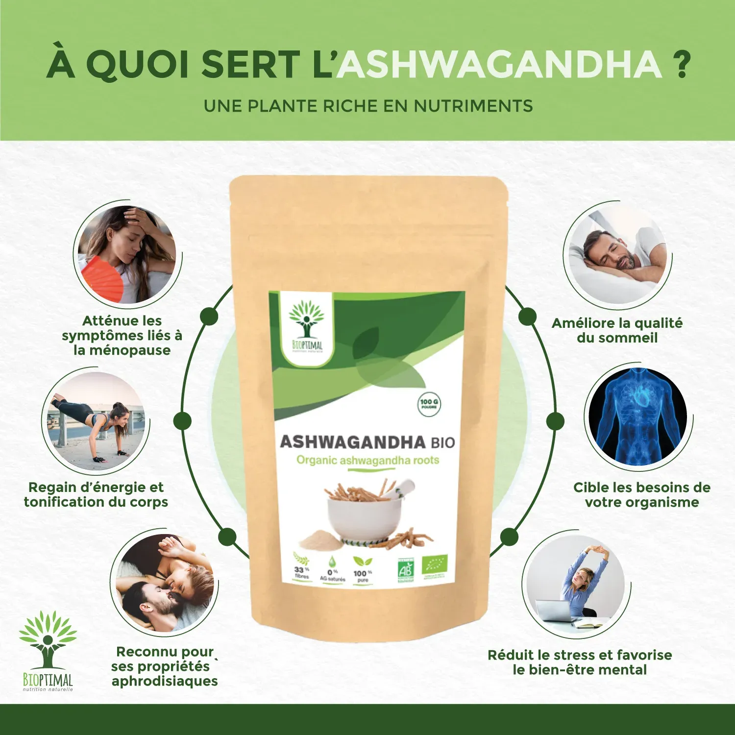 Notre produit Bioptimal nutrition naturelle : Ingrédients, uniquement de la poudre pure de racine d’ashwagandha bio. Nous avons choisi de vous proposer un format en poudre pour une utilisation simplifiée à intégrer dans votre alimentation. Mélanger 1 cuillère à soupe 5g avec 200ml de votre boisson préférée ou dans un smoothie afin de la consommer crue. Cure conseillée de 1 à 2 mois. Associations préconisées guarana, ginseng, gingembre en gélules pour l’énergie. Moringa, Maca, pour les mélanges de poudres.