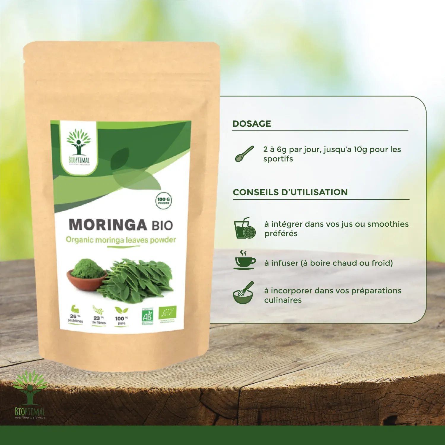 😍🍨 COMMENT LA CONSOMMER ? La poudre de Moringa s’intègre facilement à votre régime alimentaire. Dans votre boisson préférée avec un jus, mélangé avec de l’eau dans un shaker ou mixé avec des fruits ou des légumes dans un smoothie. Egalement en boissons chaudes (Tisane, infusion), dans vos plats cuisinés, en fin de cuisson, pour conserver les nutriments (soupes), ou en vinaigrette. Retrouvez nos recettes en scannant le QR code au verso du sachet !