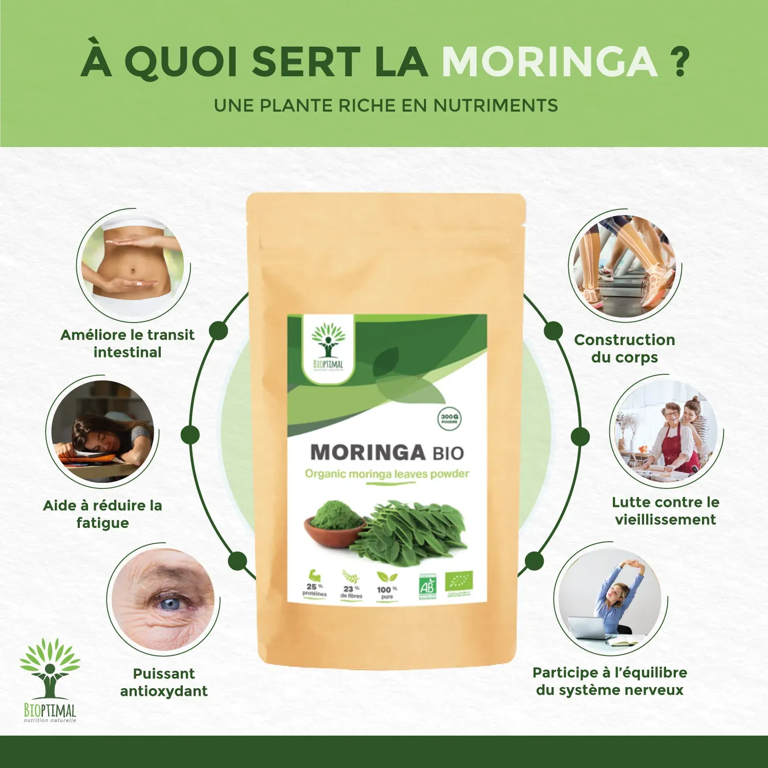 🩺💪 CONSTRUCTION DU CORPS ET MEILLEURE DIGESTION : Le moringa bio contient une part important de protéines et de fibres. Les protéines, dont les acides aminés (BCAA) sont essentiels pour le développement musculaire et osseux. Les fibres quand à elles favorisent le bien-être digestif.