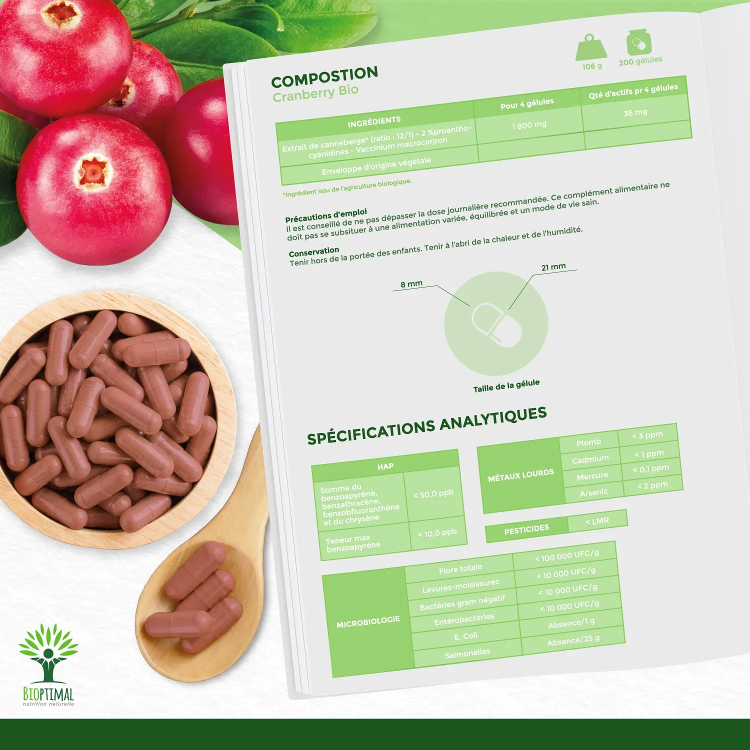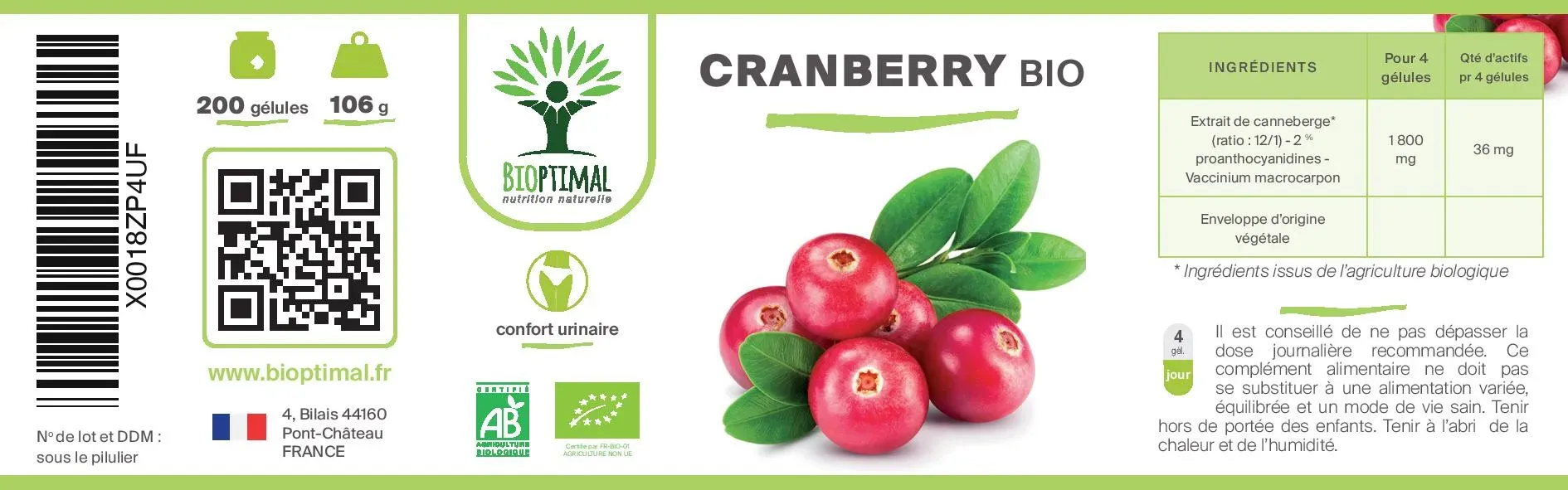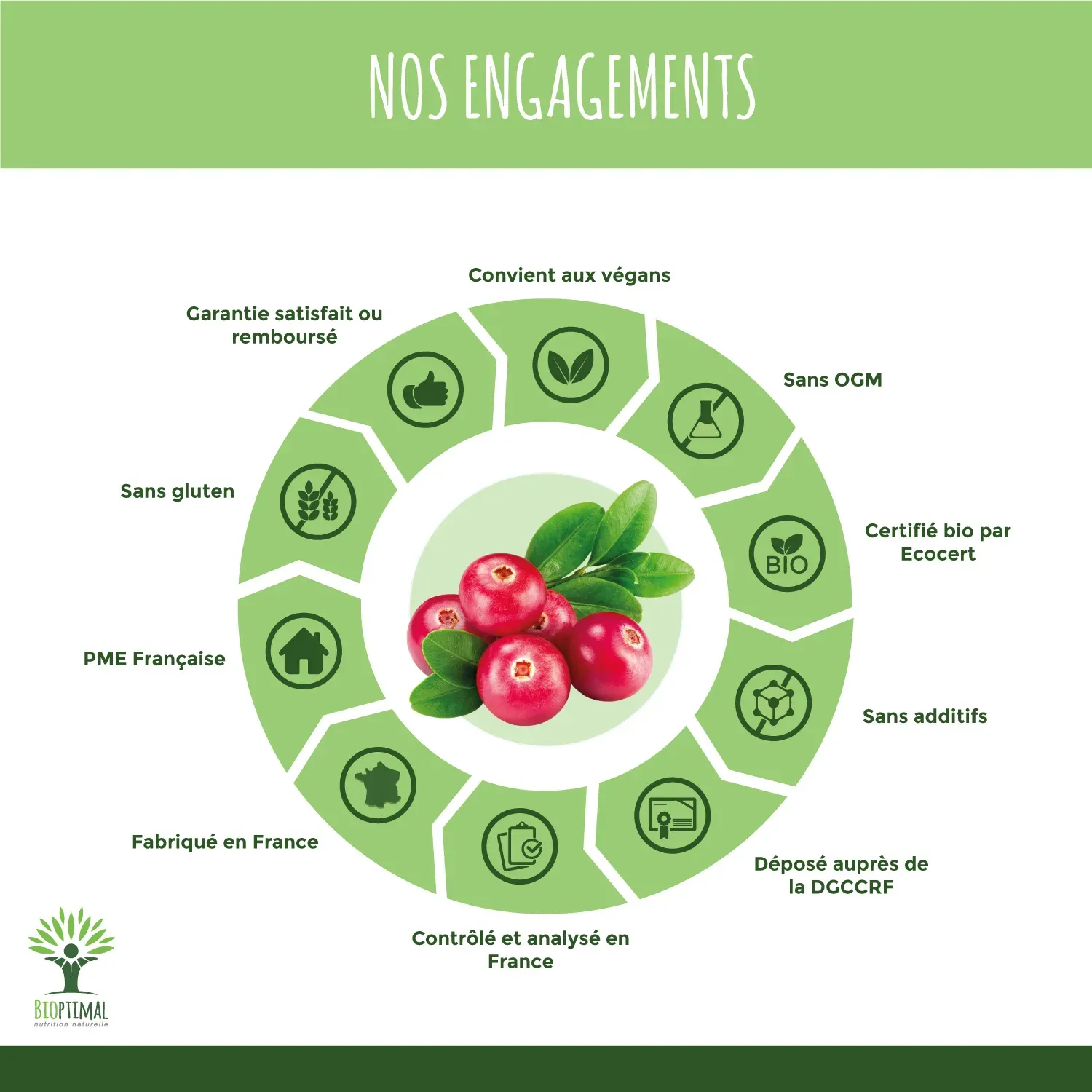QUALITÉ FRANÇAISE = SECURITÉ : Nous fabriquons nos compléments alimentaires en France, nous avons fait le choix d’encapsuler nos canneberge bio en gélules végétales et non en comprimés pour ne pas intégrer de substances controversées tel que le dextrose, le talc, le stéarate ou le carbonate de magnésium. Nos produits sont garantis sans additifs, ni ogm, ni pesticides, ni gluten, ni lactose, ni gélatine animale. Ils sont contrôlés en France et certifiés agriculture biologique, HACCP + et Afnor.