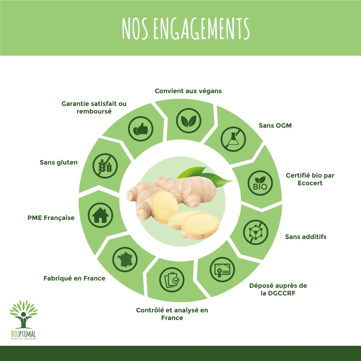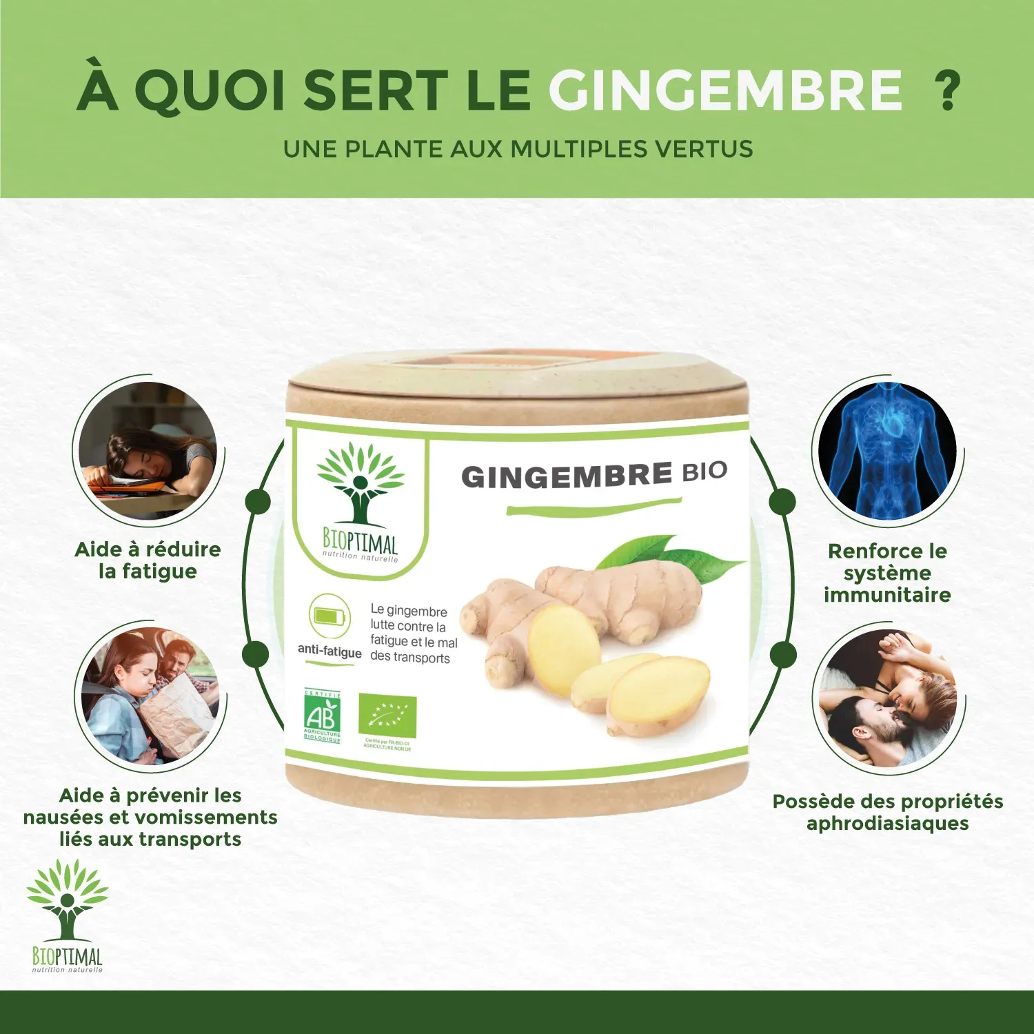Notre produit Bioptimal nutrition naturelle : Ingrédients, Racines de Gingembre biologiques de qualité supérieure. Garantie sans additif. Nous avons choisi de vous proposer un format gélule végétale plus efficace que le thé, la tisane, l’infusion ou l’huile et plus simple à intégrer à votre alimentation avec une assimilation plus rapide. Dosage 270mg / capsule. 2 x 60 gélules = 1 cure de 20 jours. Issu de l’Agriculture Biologique garanti par Ecocert. Adapté aux végétariens et au régime vegan. Fabrication Française en Bretagne. Emballage recyclable et biodégradable. Attention aux produits concurrents qui utilisent des additifs pour être compacté en comprimé.