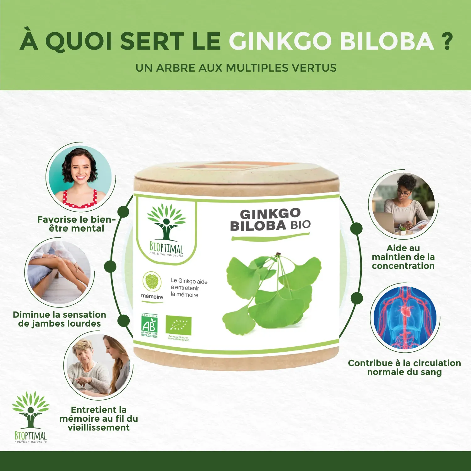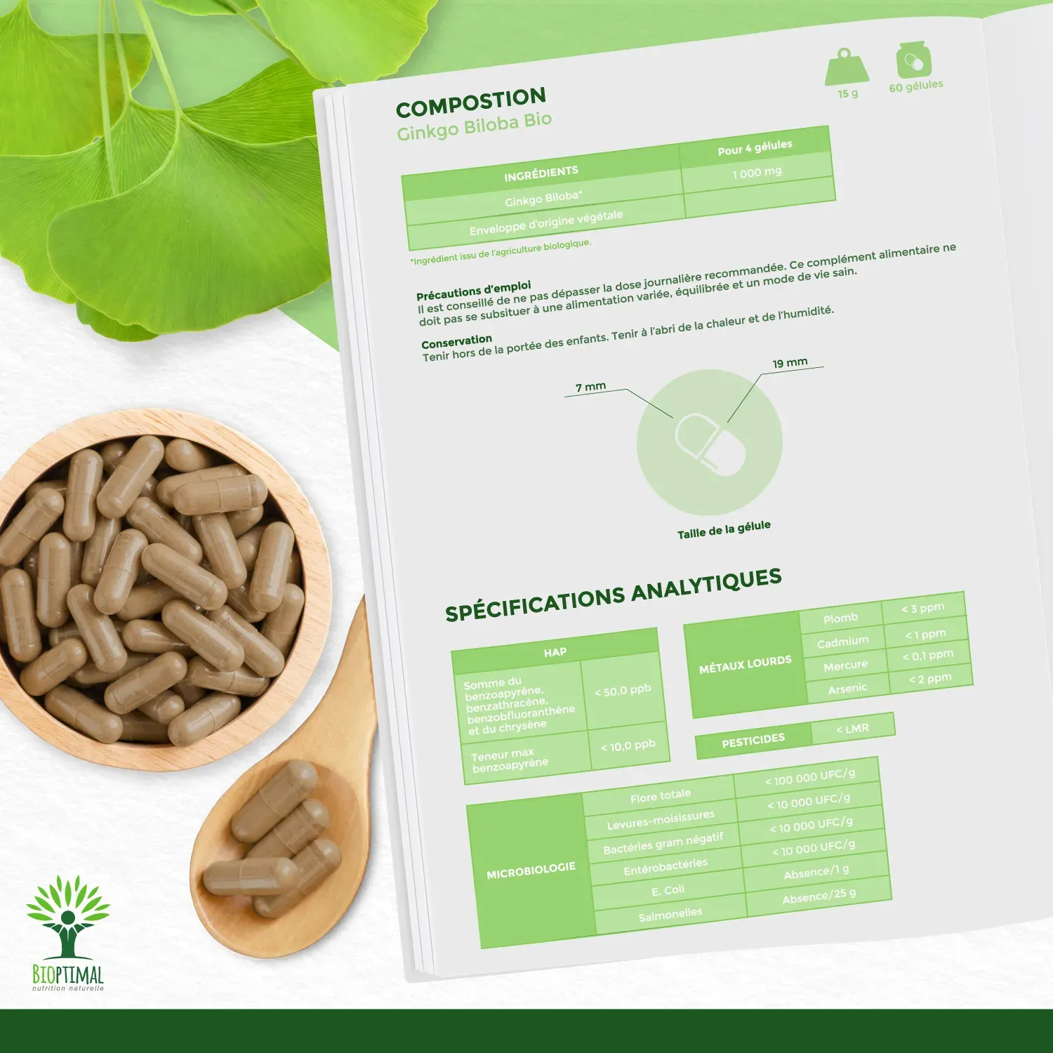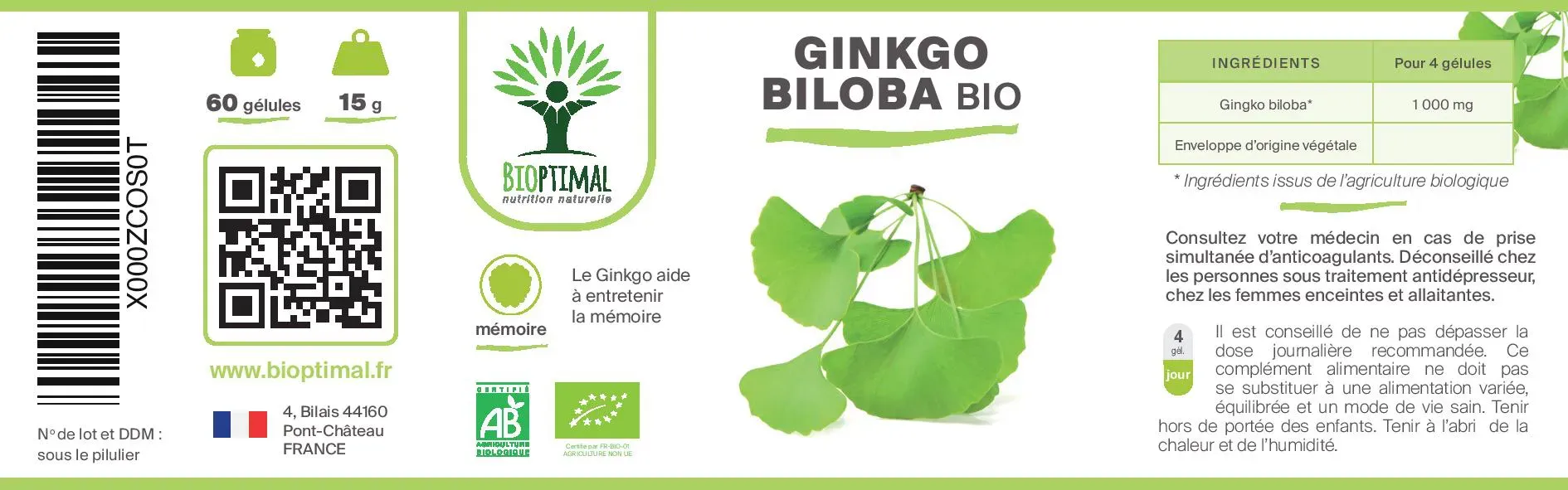 Notre produit Bioptimal nutrition naturelle : Ingrédients, uniquement feuille de ginkgo biloba bio en poudre de qualité premium. Nous avons choisi de vous proposer un format en gélule végétale plus efficace que le comprimé, l’ampoule, thé, tisane ou infusion et plus simple à intégrer à votre alimentation. Adaptée au régime vegan. Boîte de 60 gélules soit une cure de 15 jours. Avaler avec un grand verre d’eau. Nos compléments alimentaires en association possible : Gélules de curcuma, de gingembre, ginseng, olivier, vigne rouge, bacopa. C’est le complément idéal pour votre cerveau, le gingo contribue au bien-être cérébral et à une meilleure fonction cognitive.
