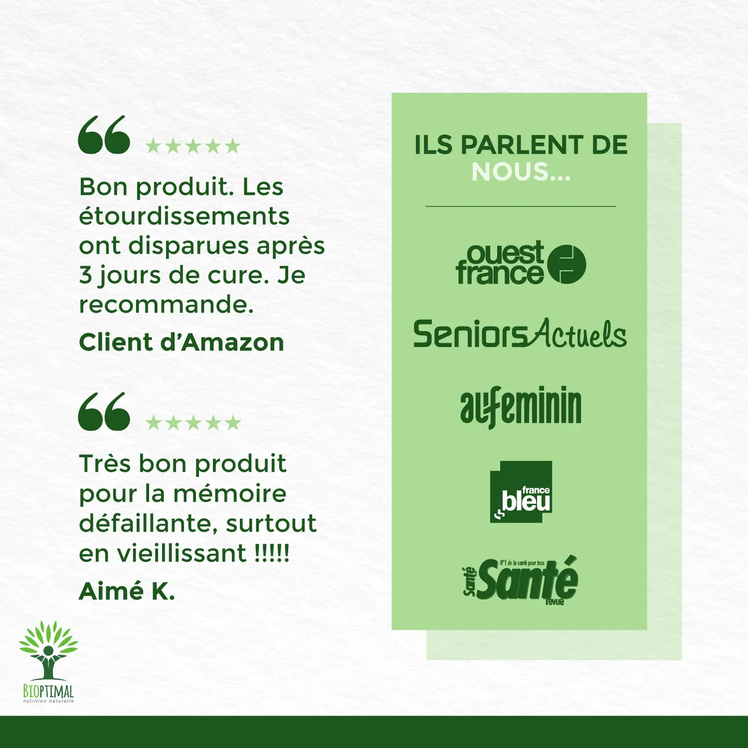 🐘👍 STIMULE LA MÉMOIRE : Le ginkgo biloba favorise la mémoire et la concentration. En effet il contribue au maintien du bien-être mental grâce à une action cérébrale renforcée. Que ce soit pour conserver la mémoire avec le déclin de l’âge afin de préserver les fonctions cognitives ou pour combattre une fatigue intellectuelle lors d’examens scolaires, il optimise l’oxygénation du cerveau, ralentit le vieillissement cellulaire et permet de lutter contre les troubles de la mémoire.