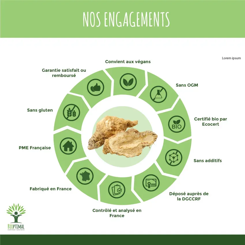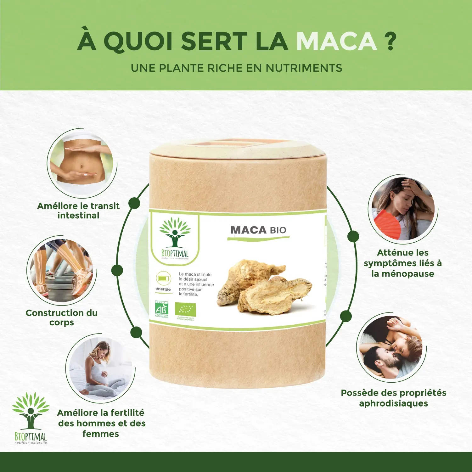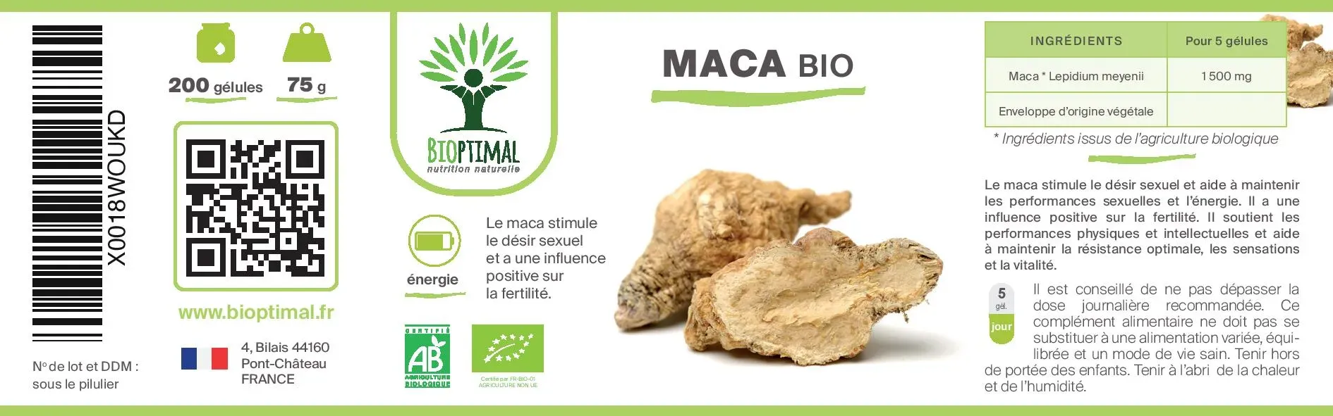 Notre produit Bioptimal nutrition naturelle : Ingrédients, uniquement de la poudre pure de maca bio (maca powder organic). Nous avons choisi de vous proposer un format en capsule végétale pour une utilisation simplifiée à intégrer dans votre alimentation. Dosage de 300 mg par pilule. Boîte de 200 unités. Avaler avec un grand verre d’eau. Cure conseillée de 1 à 2 mois. Associations préconisées guarana, ginseng, gingembre. Fabrication française en laboratoire certifiée bio par Ecocert.