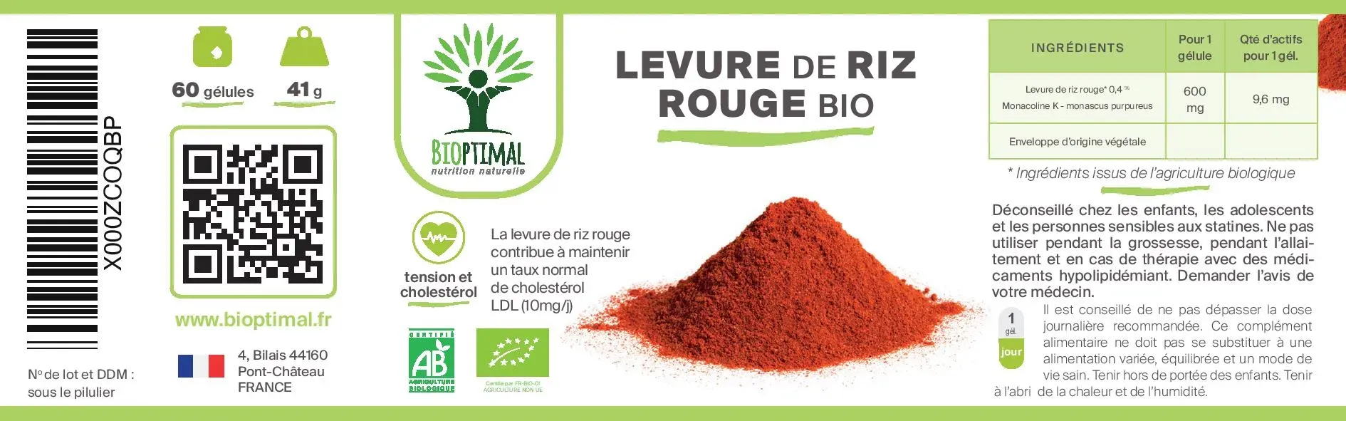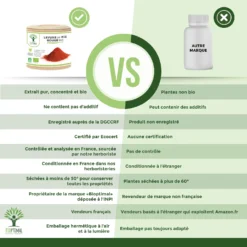 ⭐🔍 QUALITÉ FRANÇAISE = SECURITÉ : Nous fabriquons nos compléments alimentaires en France, nous avons fait le choix d’encapsuler notre levure de riz rouge bio en gélules végétales et non en comprimés pour ne pas intégrer de substances controversées tel que le talc, le stéarate ou le carbonate de magnésium. Nos produits sont garantis sans additifs, ni sucre, ni ogm, ni pesticides, ni gluten, ni lactose, ils sont contrôlés en France et certifiés agriculture biologique, HACCP + et Afnor.