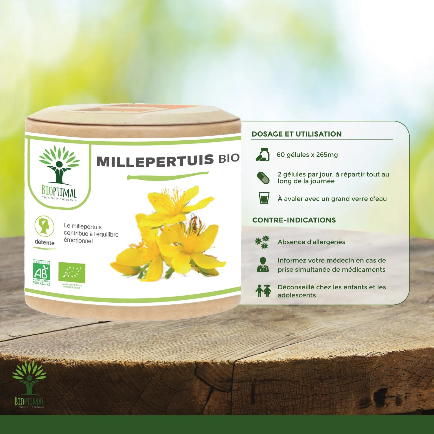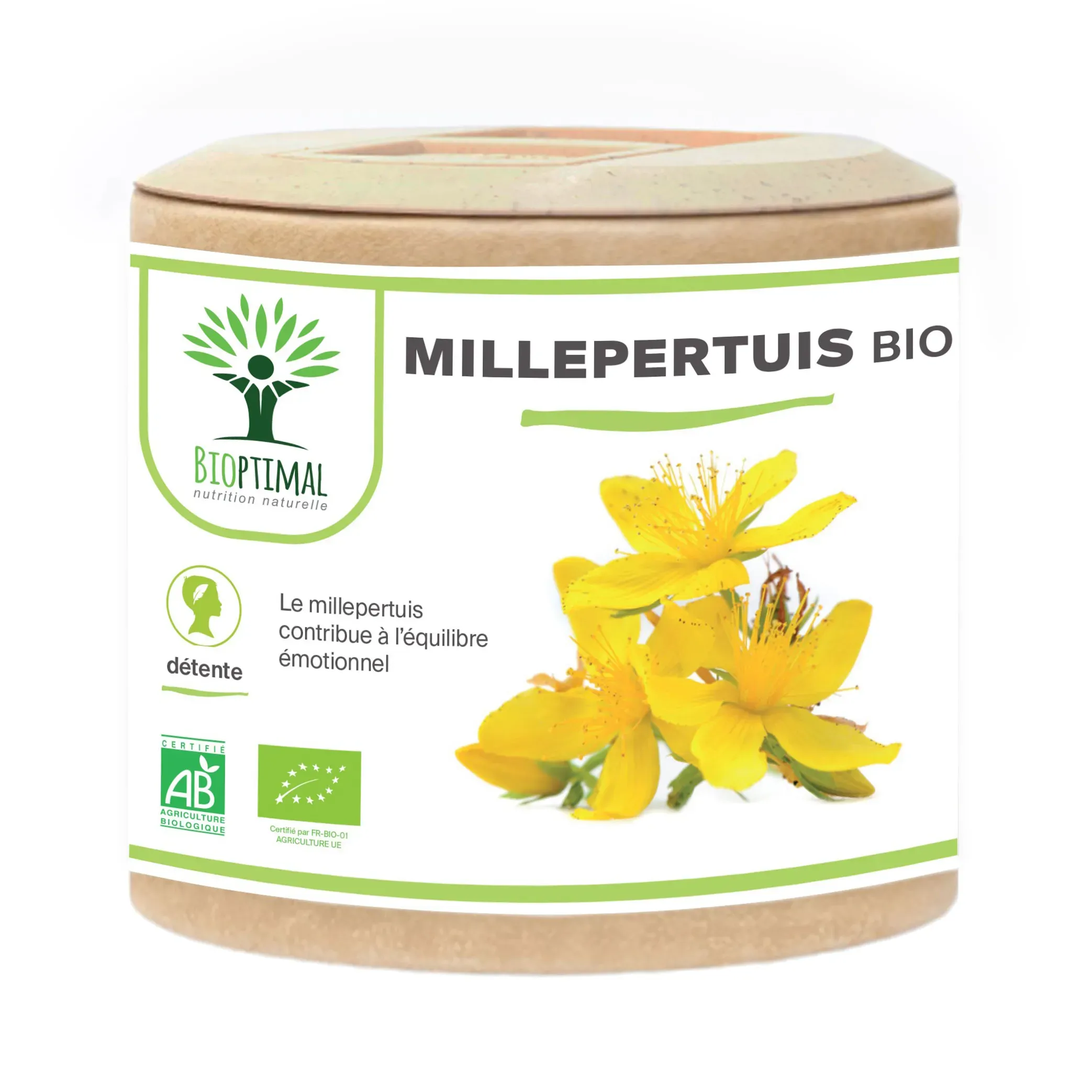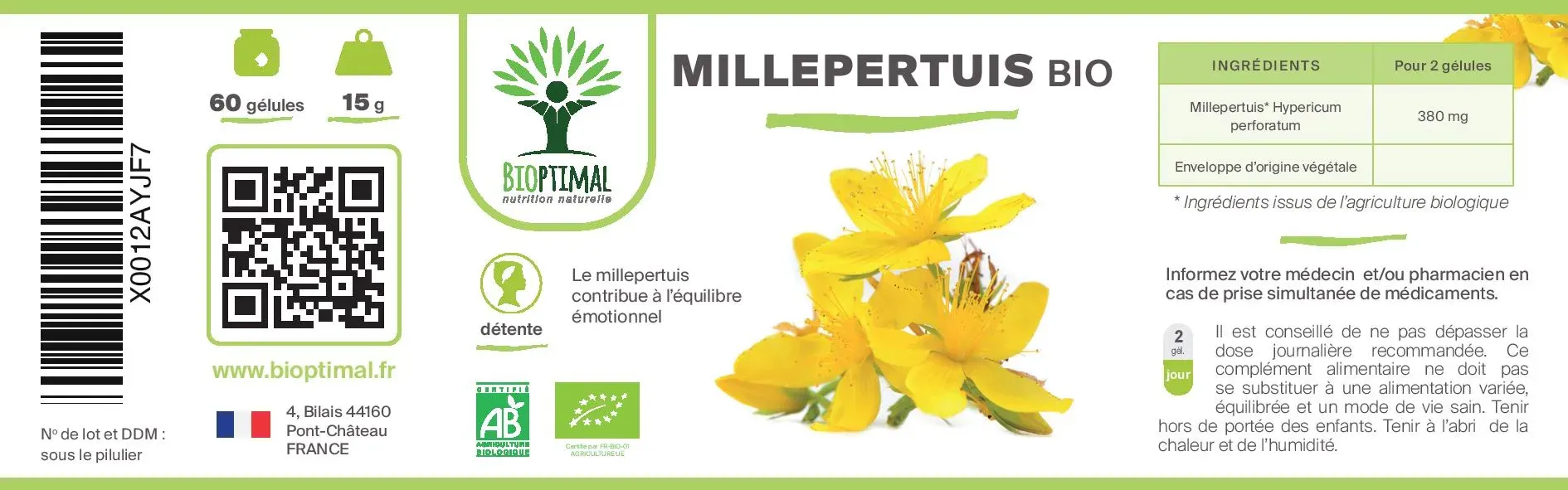 Notre produit Bioptimal nutrition naturelle : Ingrédients, Millepertuis (Hypericum Perforatum). Garantie sans additif. Nous avons choisi de vous proposer un format gélule végétale plus efficace que le thé, tisane ou infusion, car pas d’apport liquide avant de se coucher, et plus simple à intégrer à votre alimentation avec une assimilation plus rapide. . Dosage 190mg / capsule. Dose recommandée. 1 boîte de 200 gélules = 1 cure 3 mois – 100 jours. Issu de l’Agriculture Biologique garanti par Ecocert. Adapté aux végétariens et au régime vegan. Fabrication Française en Bretagne. Emballage recyclable et biodégradable. Attention à la valériane ou l’extrait qui sont souvent ajouté à du dextrose ou maltodextrine pour est compacté en comprimé.
