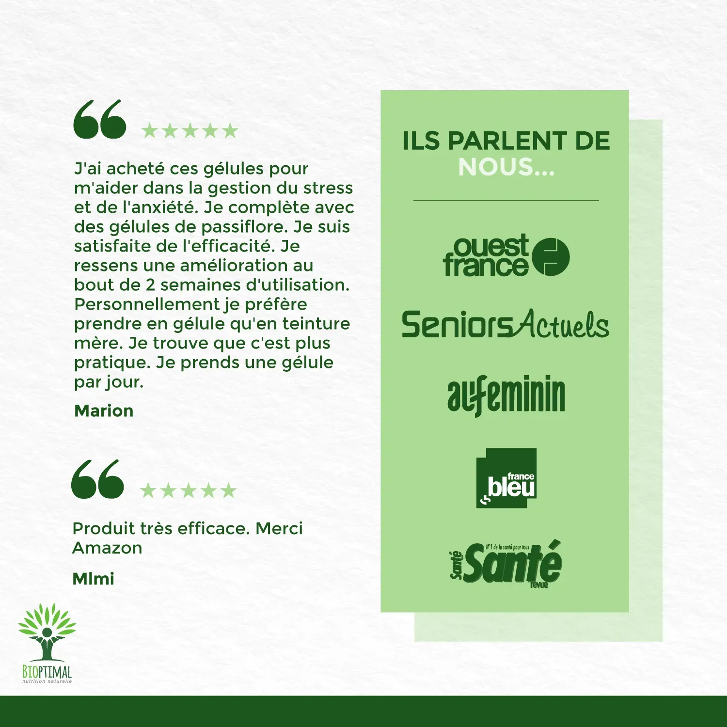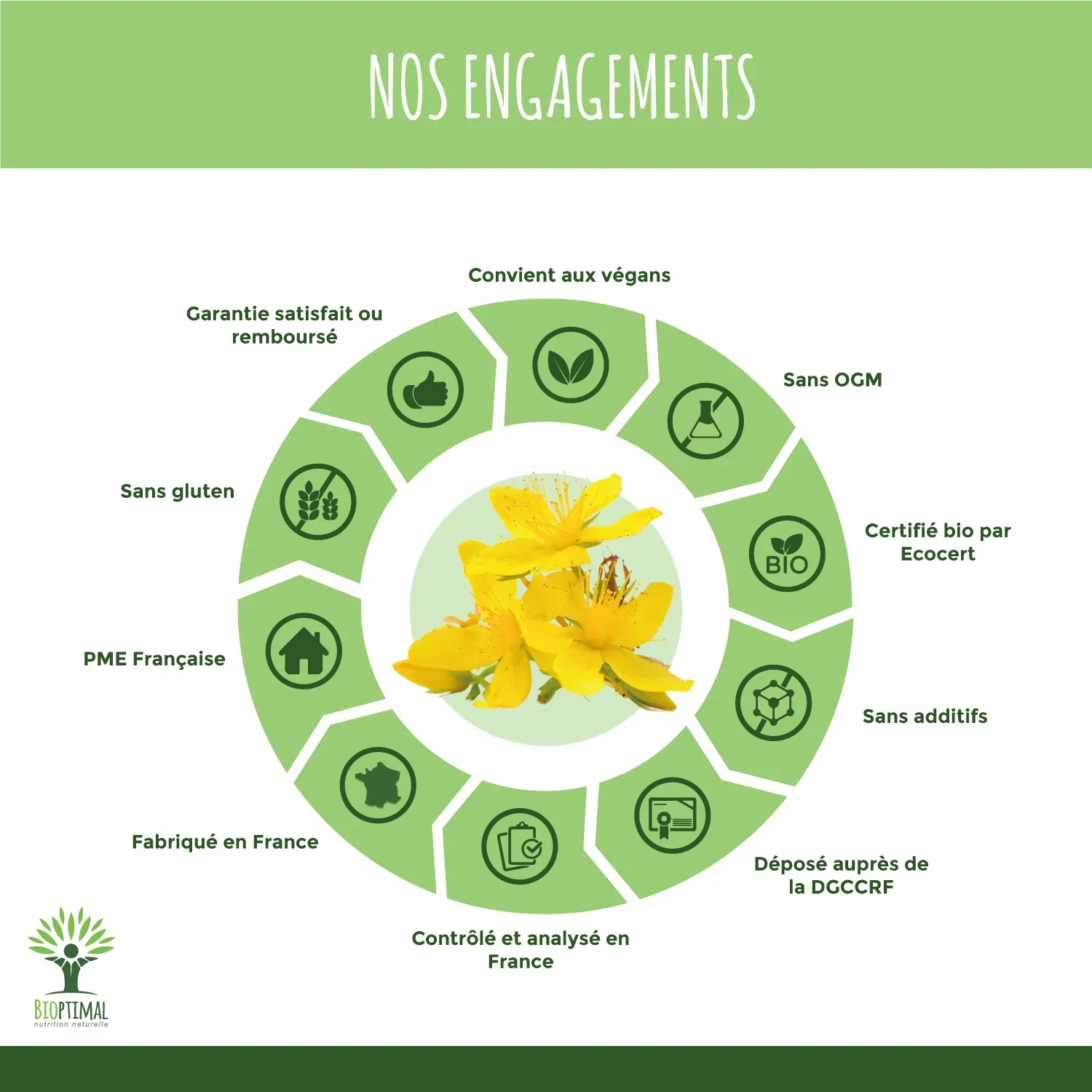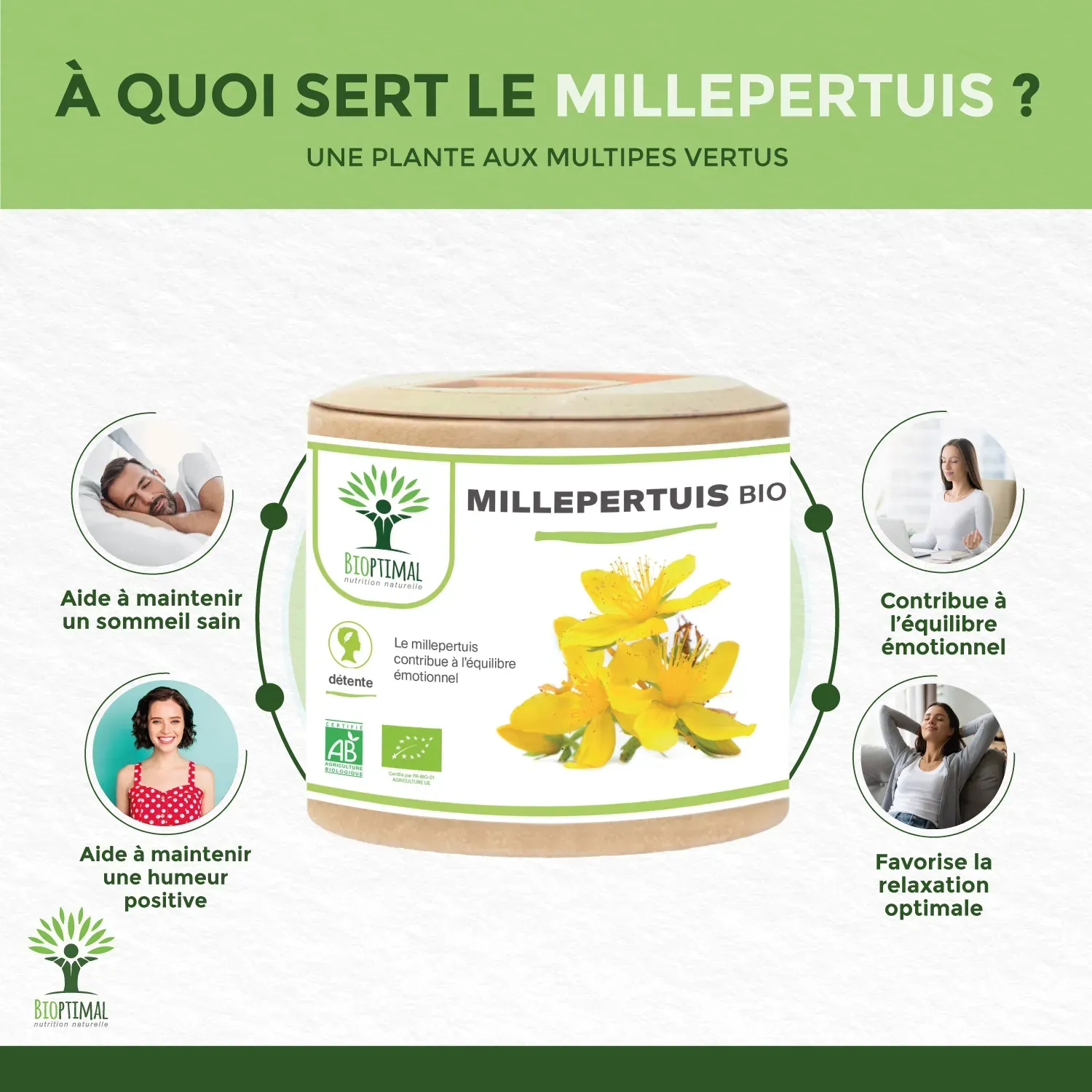 Notre produit Bioptimal nutrition naturelle : Ingrédients, Millepertuis (Hypericum Perforatum). Garantie sans additif. Nous avons choisi de vous proposer un format gélule végétale plus efficace que le thé, tisane ou infusion, car pas d’apport liquide avant de se coucher, et plus simple à intégrer à votre alimentation avec une assimilation plus rapide. . Dosage 190mg / capsule. Dose recommandée. 1 boîte de 200 gélules = 1 cure 3 mois – 100 jours. Issu de l’Agriculture Biologique garanti par Ecocert. Adapté aux végétariens et au régime vegan. Fabrication Française en Bretagne. Emballage recyclable et biodégradable. Attention à la valériane ou l’extrait qui sont souvent ajouté à du dextrose ou maltodextrine pour est compacté en comprimé.