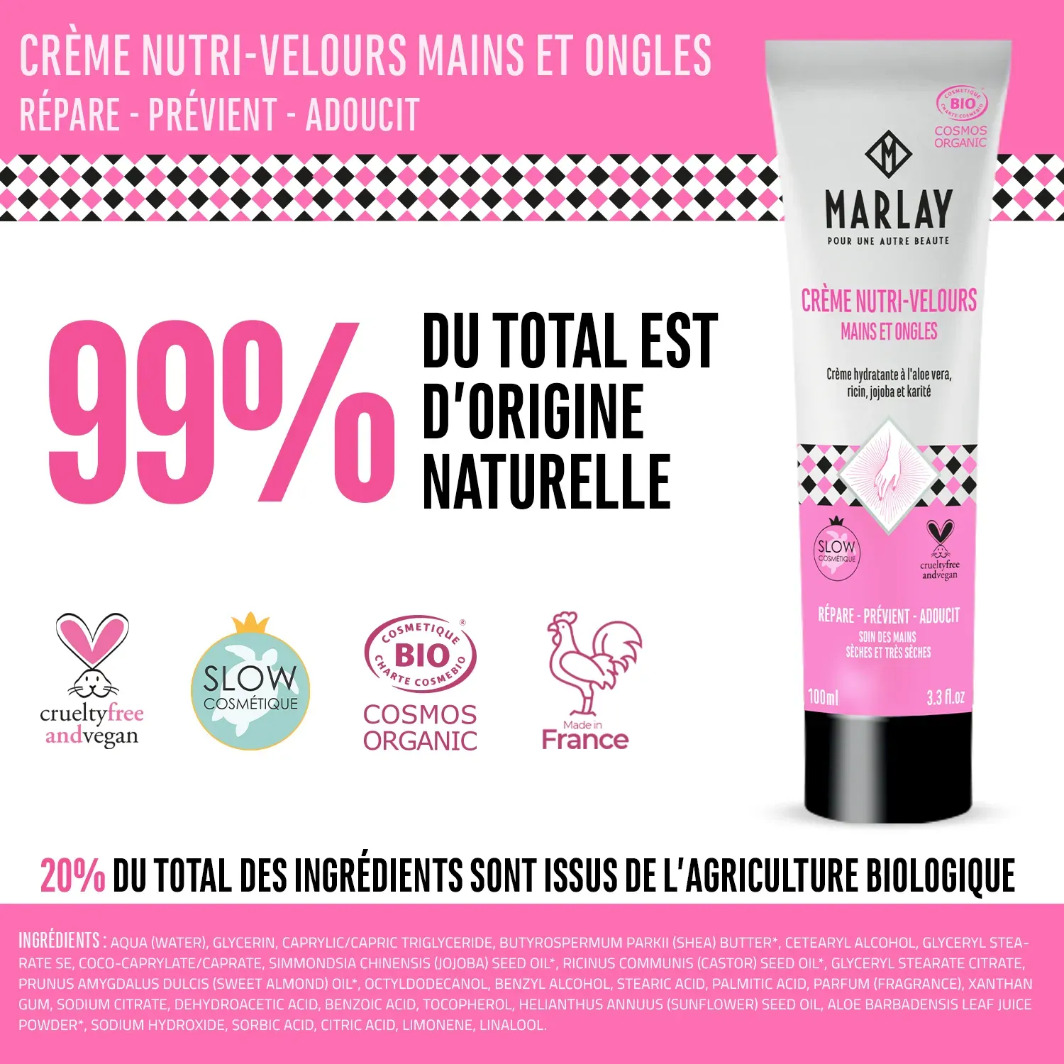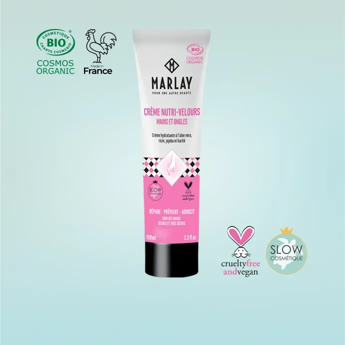 Les ingrédients comme le beurre de Karité, l’huile de Jojoba et l’huile d’amande douce réparent la peau, l’Aloe Vera l’hydrate; l’huile de ricin Bio adoucit les mains et fortifie les ongles.