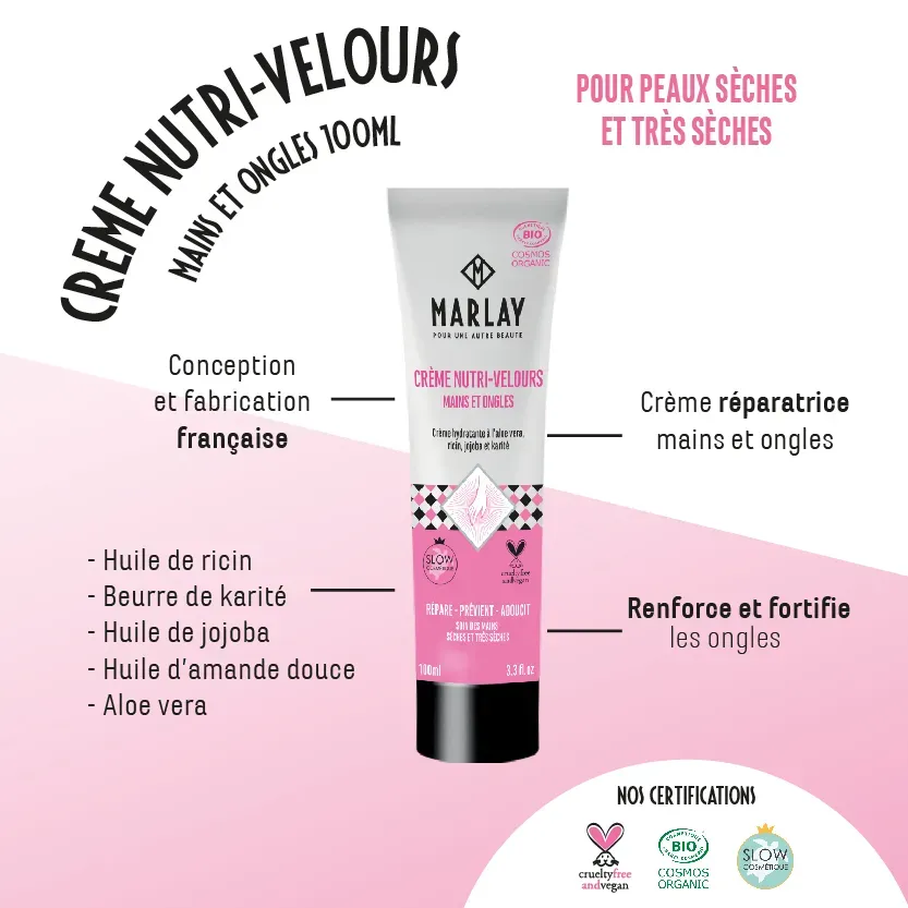 Cette formule répond aux états de déshydratation sévère et offre un effet velours grâce à ses actifs extrêmement hydratants et régénérants. Contrairement à la plupart des crèmes mains qui adoucissent sur le moment, la crème Nutri-Velours agit sur la durée en nourrissant la peau en profondeur.
