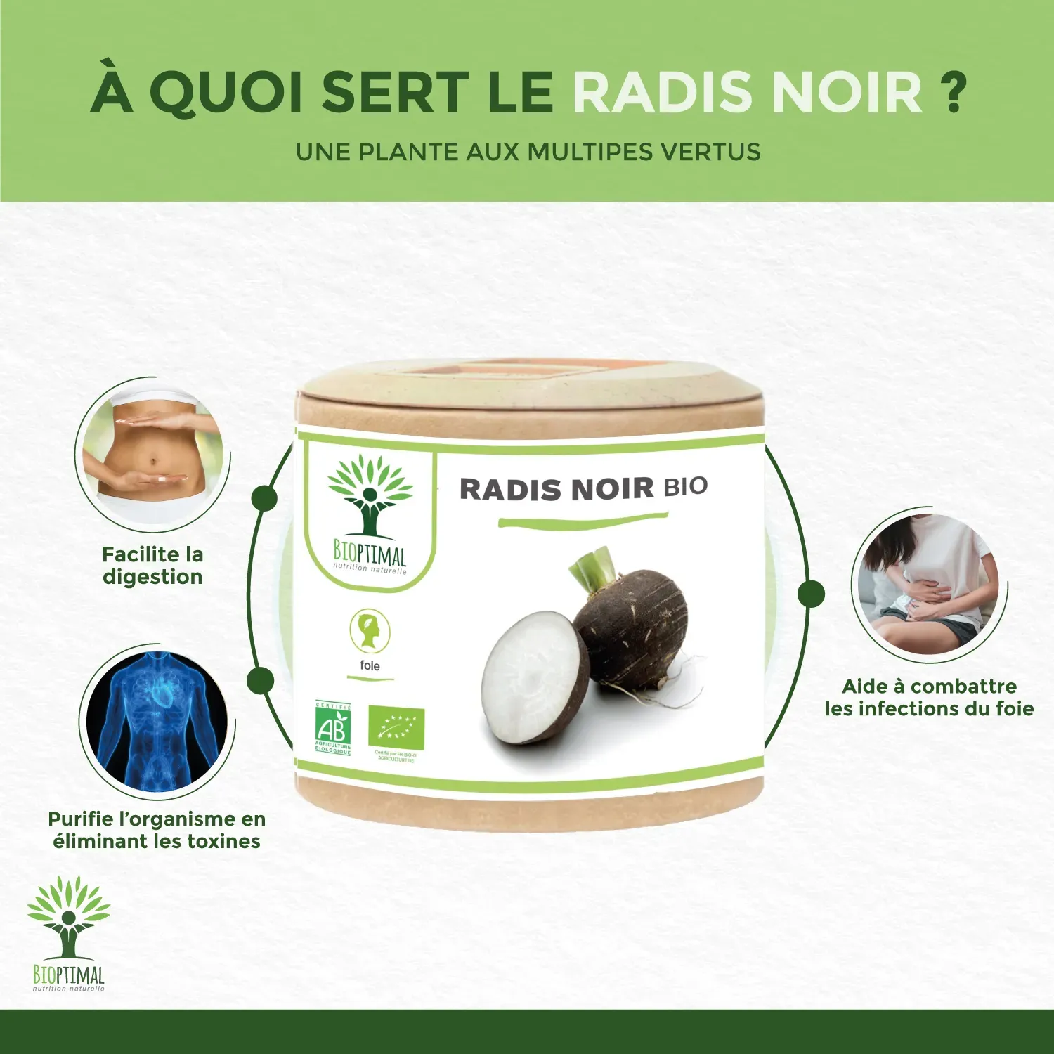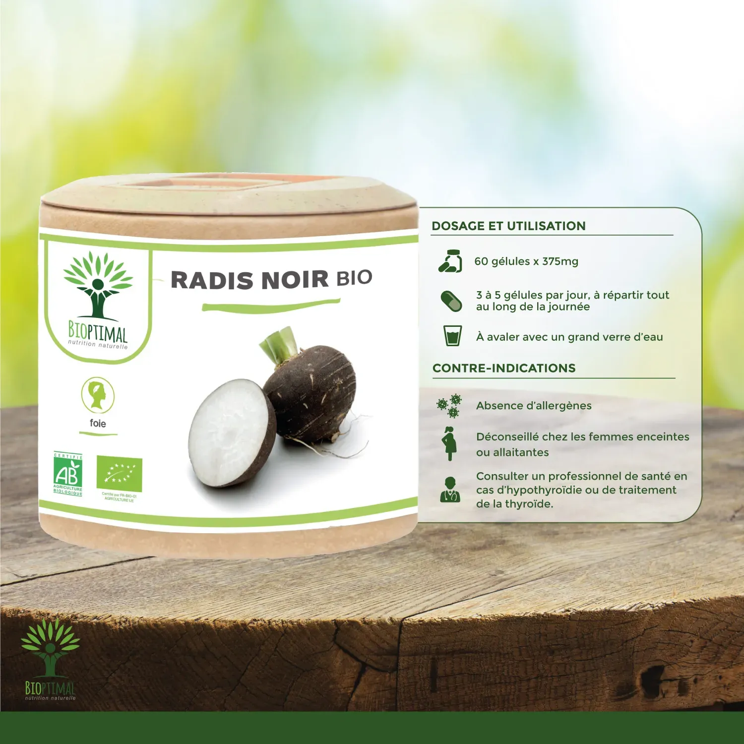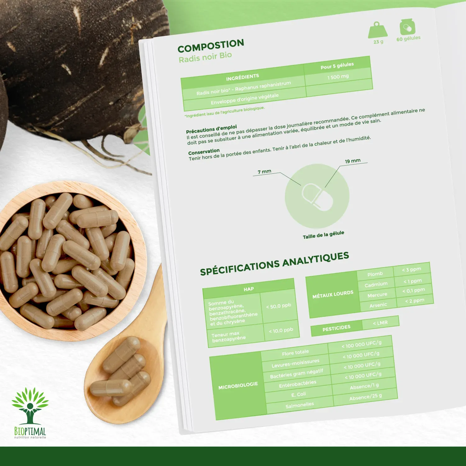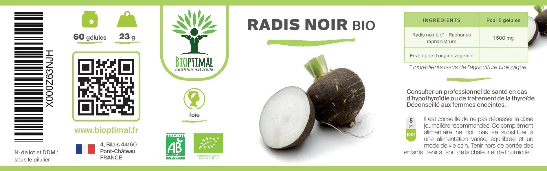 🎯👍 UNE ACTION CIBLÉE : Nos gélules de radis noir bio, soutiennent la santé du foie grâce au principe actif qu’ils contiennent. Ses deux fonctions principales sont qu’il contribue à la protection du foie et favorise sa détoxification à la suite de traitements médicamenteux ou après une alimentation trop grasse et trop sucrée, notamment après les fêtes ou la période estivale. Il stimule l’action de la bile et évacue les déchets vers l’intestin.