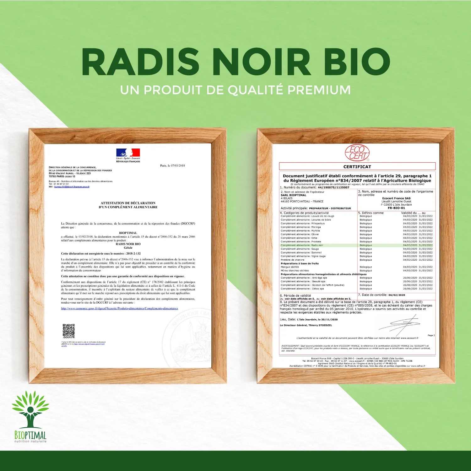 ⭐🔍 QUALITÉ FRANÇAISE = SECURITÉ : Nous fabriquons nos compléments alimentaires en France, nous avons fait le choix d’encapsuler notre radis noir bio en gélules végétales et non en comprimés pour ne pas intégrer de substances controversées tel que le dextrose, le talc, le stéarate ou le carbonate de magnésium. Nos produits sont garantis sans additifs, ni ogm, ni pesticides, ni gluten, ni gélatine animale. Ils sont contrôlés en France et certifiés agriculture biologique, HACCP + et Afnor.