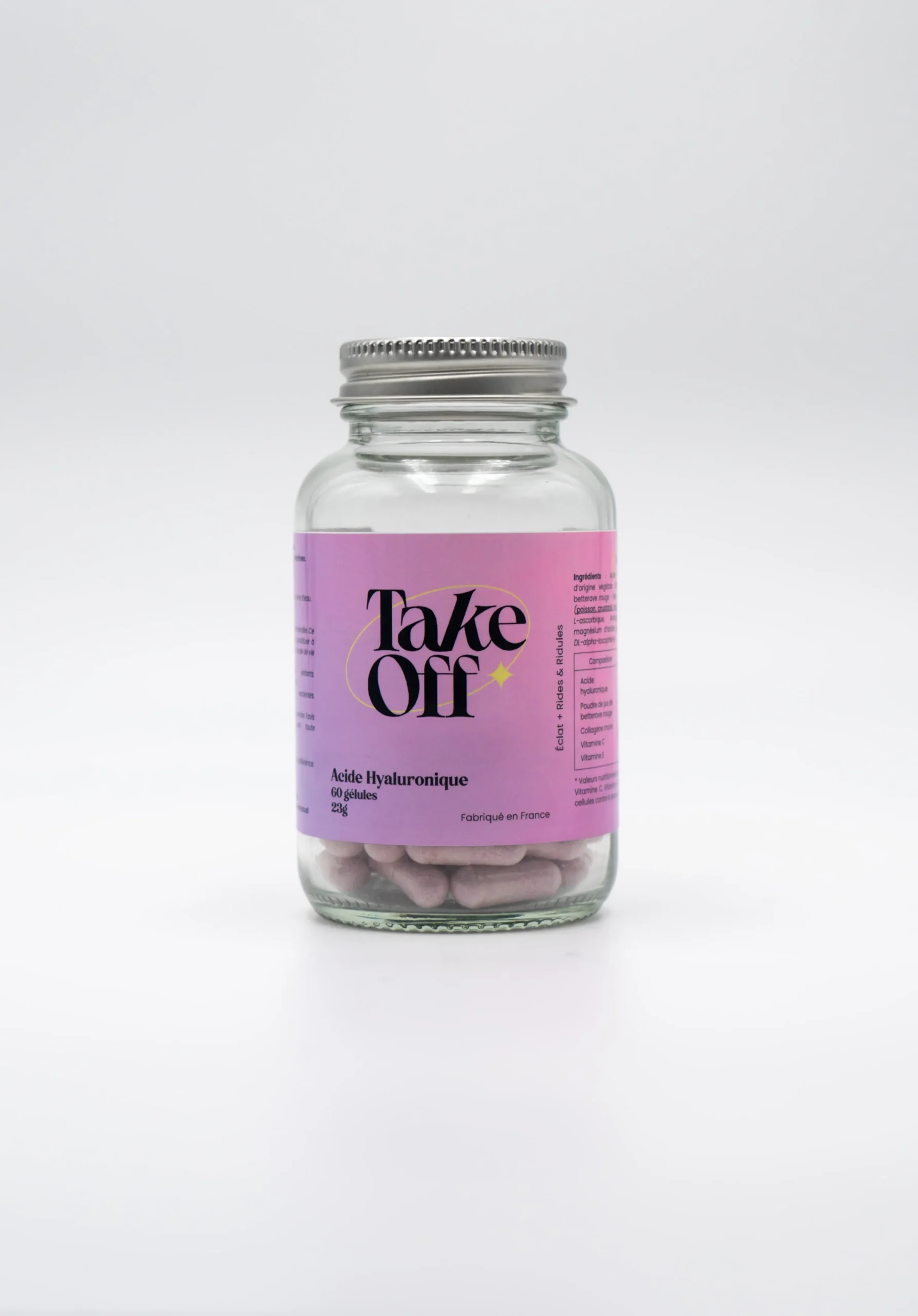 Acide hyaluronique, Enveloppe d’origine végétale (HPMC), Poudre de jus de betterave rouge – Beta vulgaris, Collagène marin (poisson, crustacé, mollusque), Vitamine C – Acide L-ascorbique, Antiagglomérant : Sels demagnésium d’acides gras, Vitamine E – Acétate DL-alpha-tocophéryle