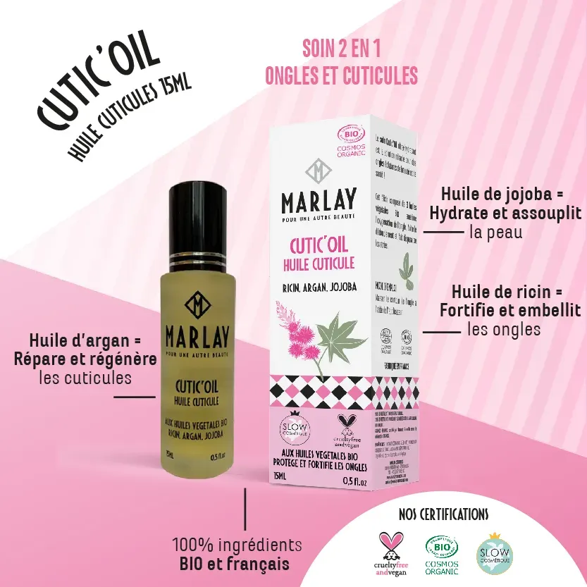 L’huile de soin cuticules et ongles Marlay procure un soin 2 en 1 efficace et pratique :
