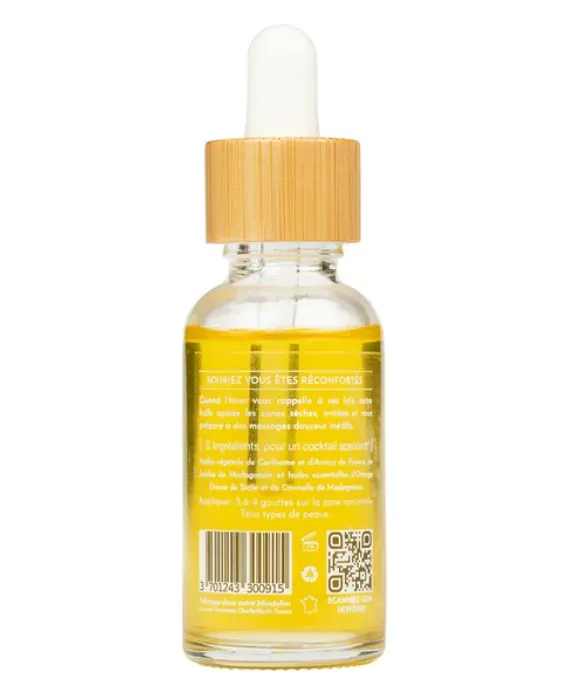 Pour cela, trois ingrédients phare : les huiles françaises de carthame et d’arnica, pour nourrir et réparer, et l’indispensable huile de jojoba. En plus, on lui a concocté une douce odeur de cannelle orange, pour vous rappeler les pain d’épices, les biscuits, les chocolats de Noël ; il ne manque plus que le vin chaud et on y est.