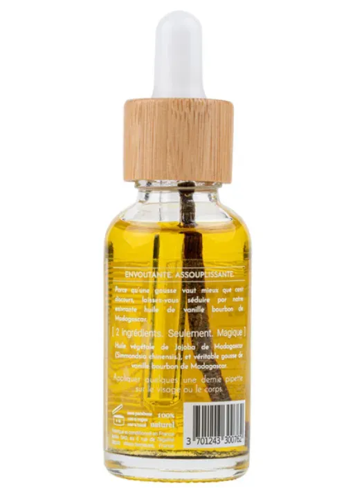 Et nous vous avons laissé de la véritable vanille dans le flacon. Pour que les propriétés restent et ne s’atténuent pas. Parce qu’on ne fait pas les choses à moitié. Et pour vous faire plaisir, tout simplement. Une huile unique en son genre, dont vous ne pourrez plus vous passer.