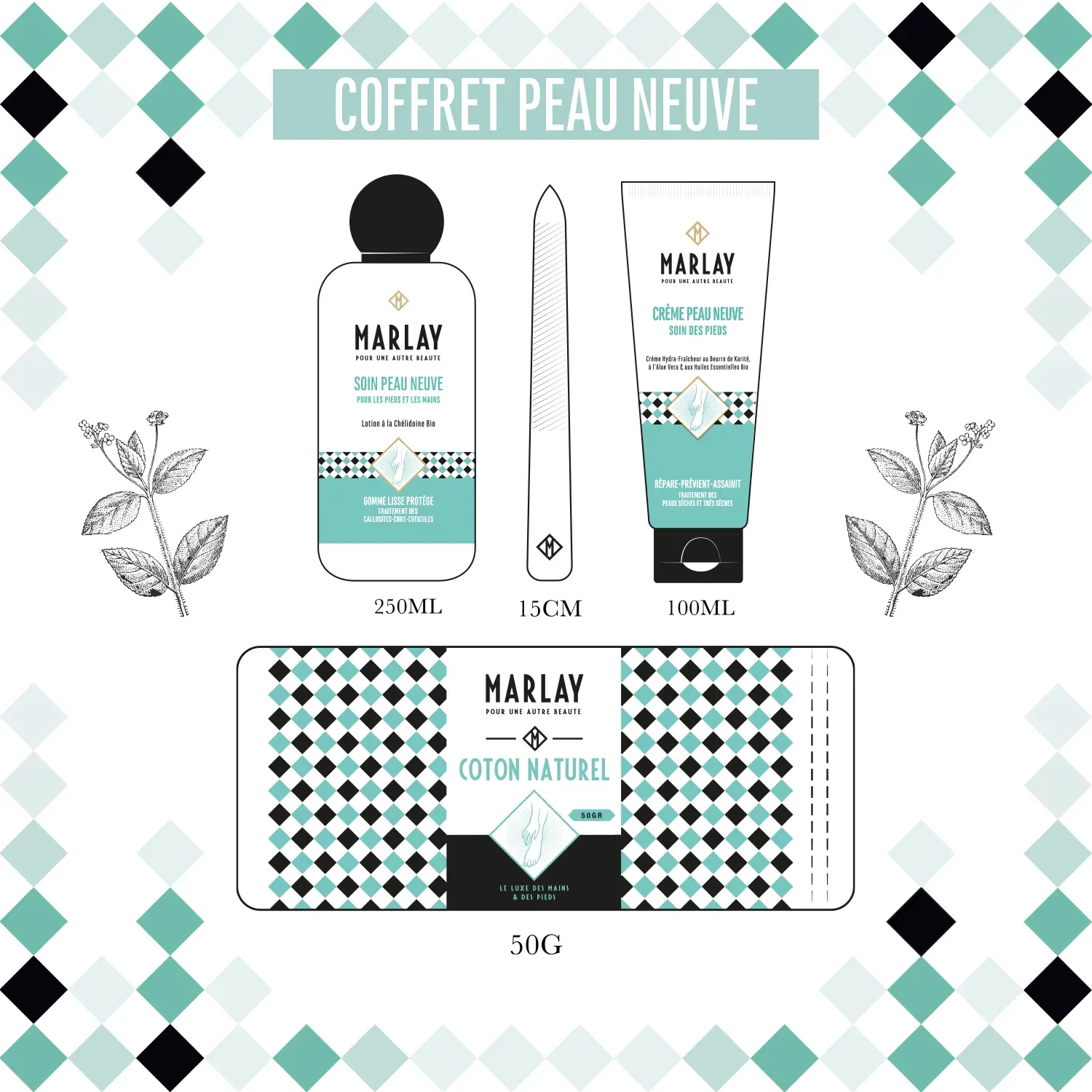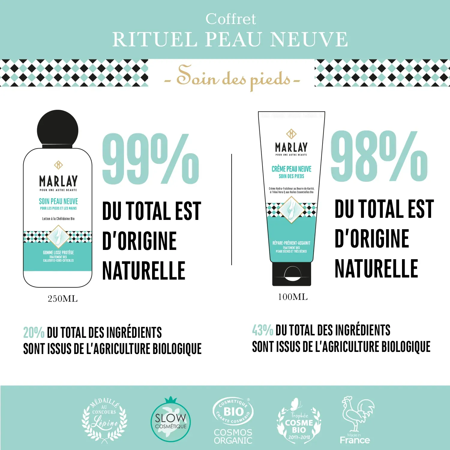 Le kit contient : 1 Soin Peau Neuve 250 ml + 1 Crème Peau Neuve 100 ml + 1 racloir en métal + coton naturel.