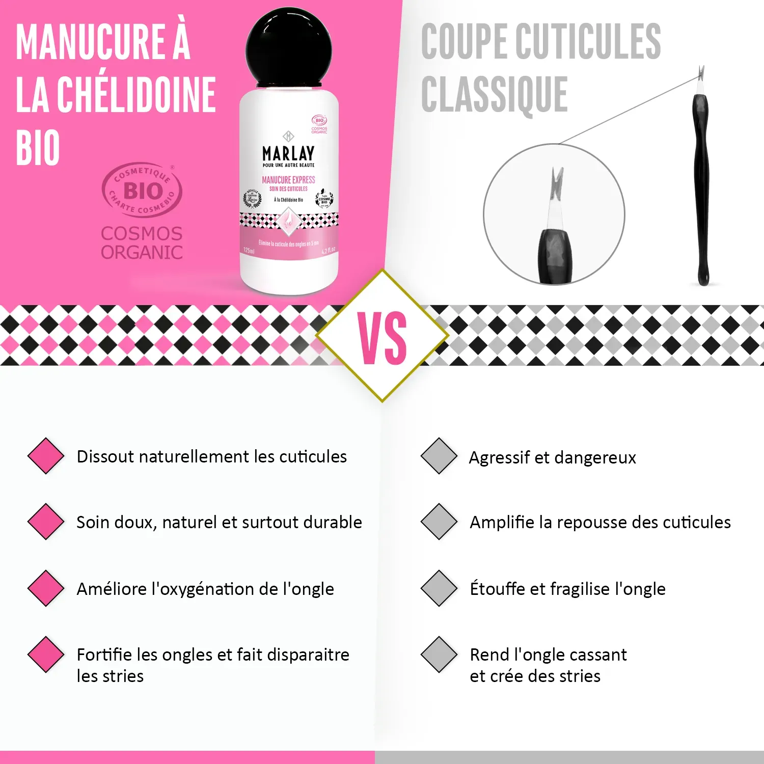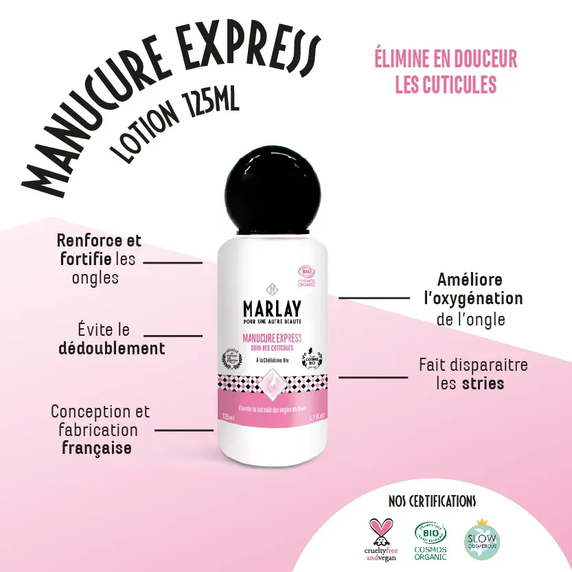 Le soin Manucure Express permet d’éviter les dégâts causés par les coupe-cuticules qui peuvent blesser et créent plus de peaux mortes qui vont étouffer les ongles et ainsi les fragiliser.