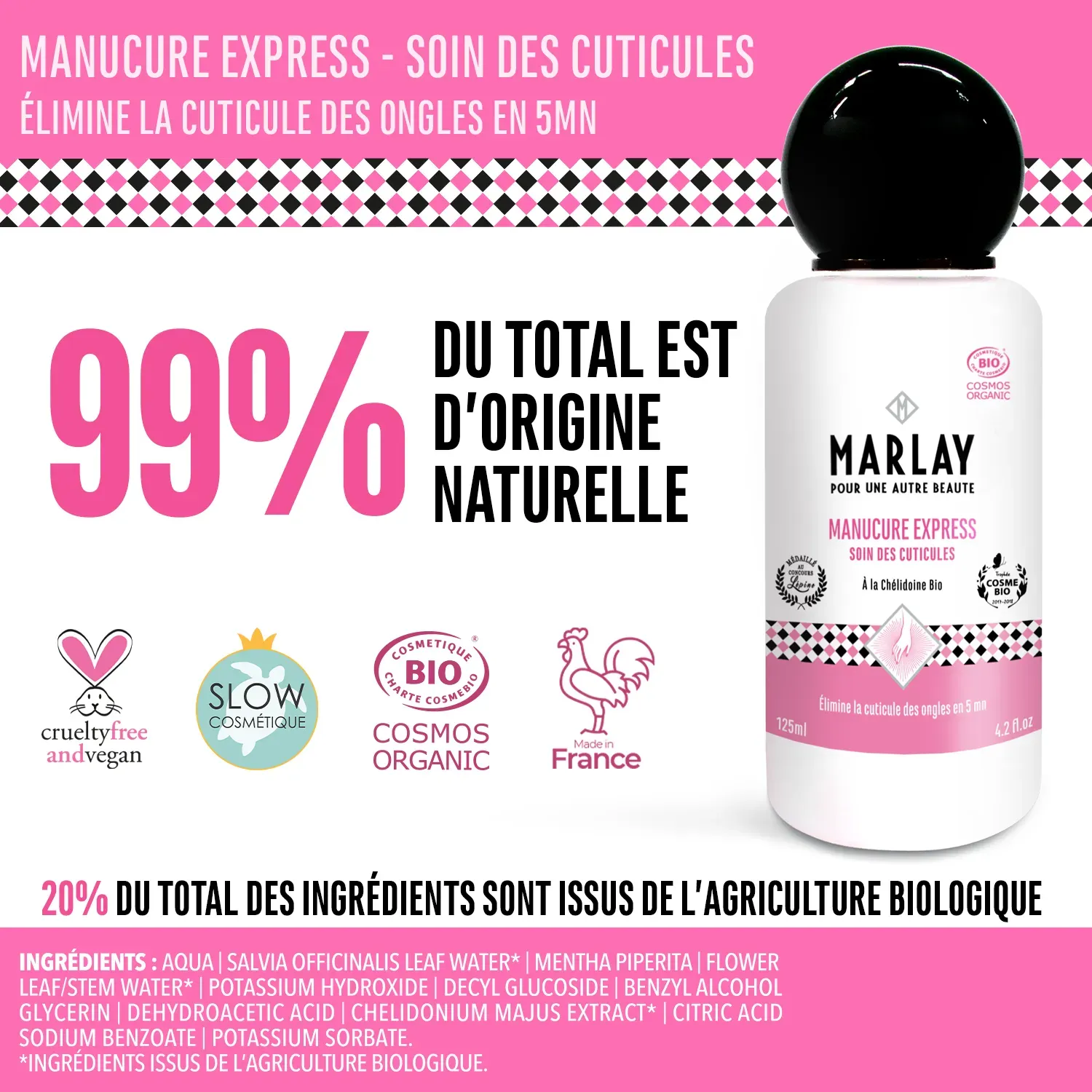 Très pratique, cette lotion Made in France dissout en douceur et naturellement les cuticules disgracieuses en 5 mn. On peut ensuite les retirer sans agresser la peau, pour des ongles nets et prêts à être vernis.