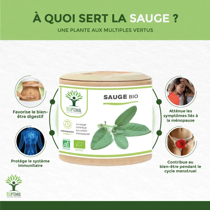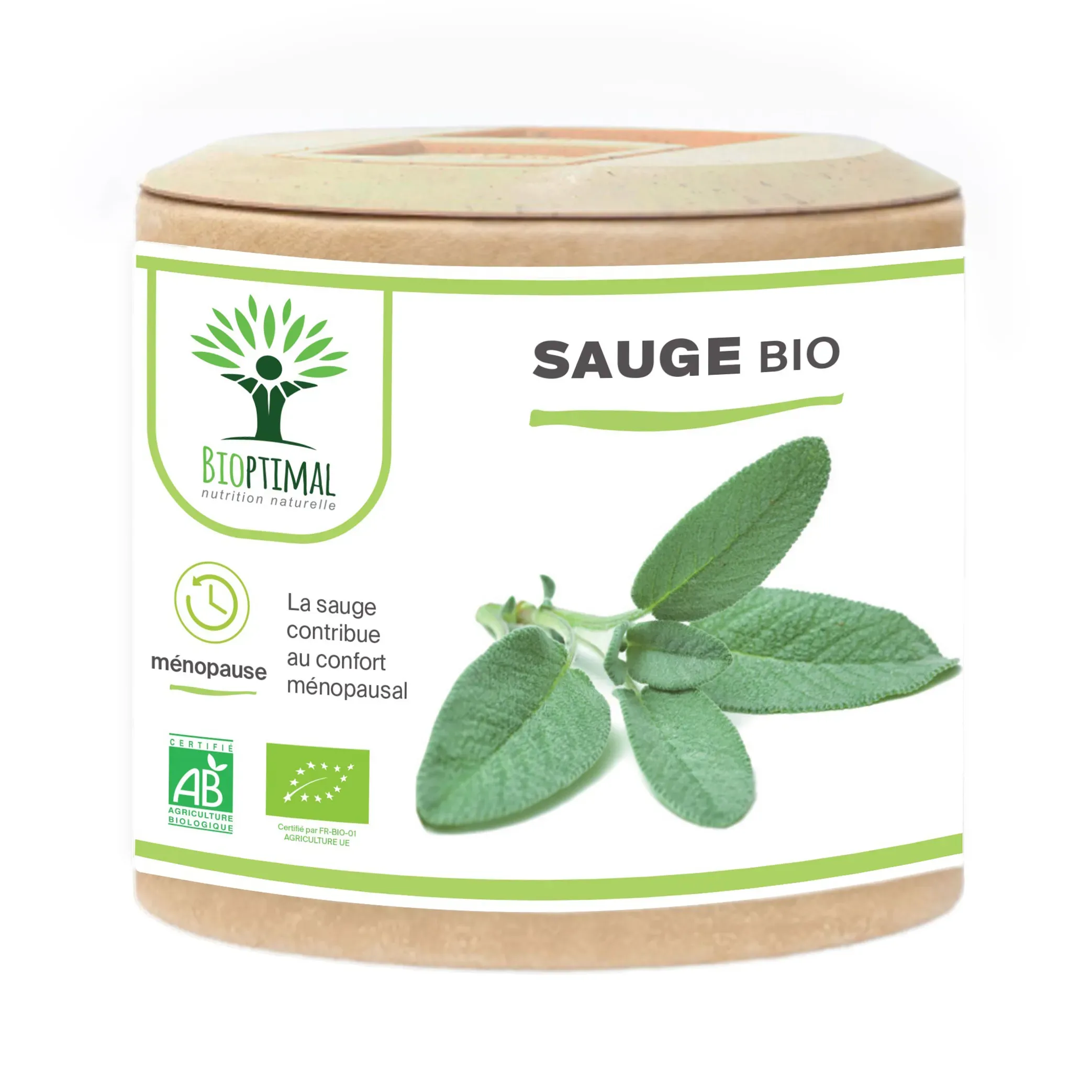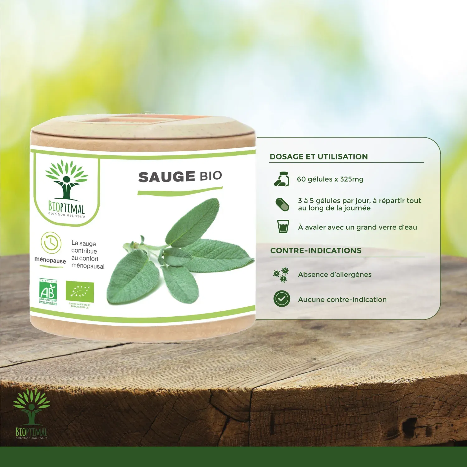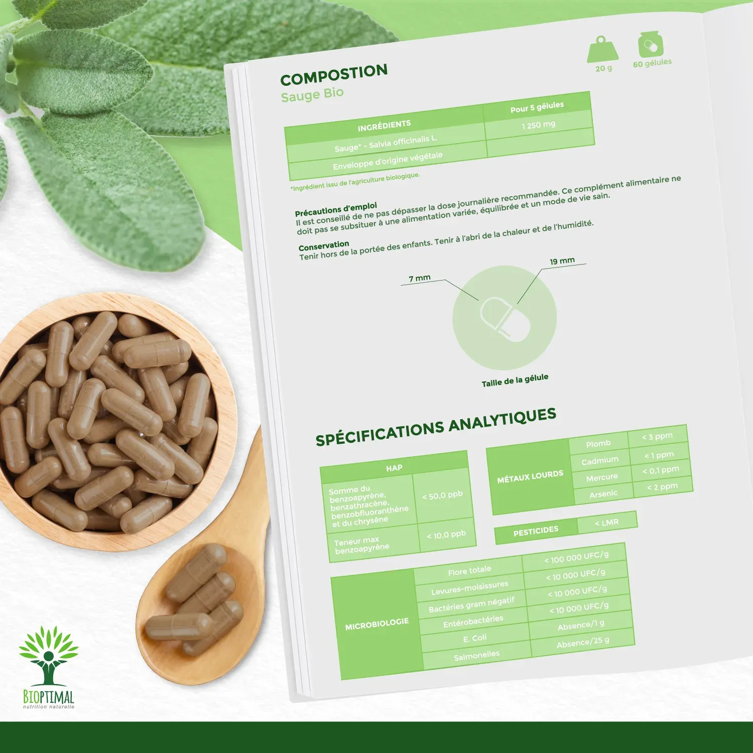Notre produit Bioptimal nutrition naturelle : Ingrédients, pour nos gélules nous utilisons uniquement de la feuille de sauge officinale séchée. Nous avons choisi de vous proposer un format gélule végétale plus efficace que le thé, tisane ou infusion et plus simple à intégrer à votre alimentation. Dosage de 250 mg par capsule. Boîte de 60 unités. Adapté au régime vegan