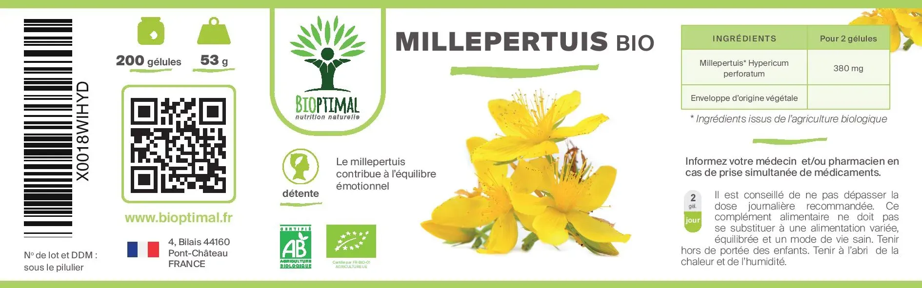 Notre produit Bioptimal nutrition naturelle : Ingrédients, Millepertuis (Hypericum Perforatum). Garantie sans additif. Nous avons choisi de vous proposer un format gélule végétale plus efficace que le thé, tisane ou infusion, car pas d’apport liquide avant de se coucher, et plus simple à intégrer à votre alimentation avec une assimilation plus rapide. . Dosage 190mg / capsule. Dose recommandée. 1 boîte de 200 gélules = 1 cure 3 mois – 100 jours. Issu de l’Agriculture Biologique garanti par Ecocert. Adapté aux végétariens et au régime vegan. Fabrication Française en Bretagne. Emballage recyclable et biodégradable. Attention à la valériane ou l’extrait qui sont souvent ajouté à du dextrose ou maltodextrine pour est compacté en comprimé.
