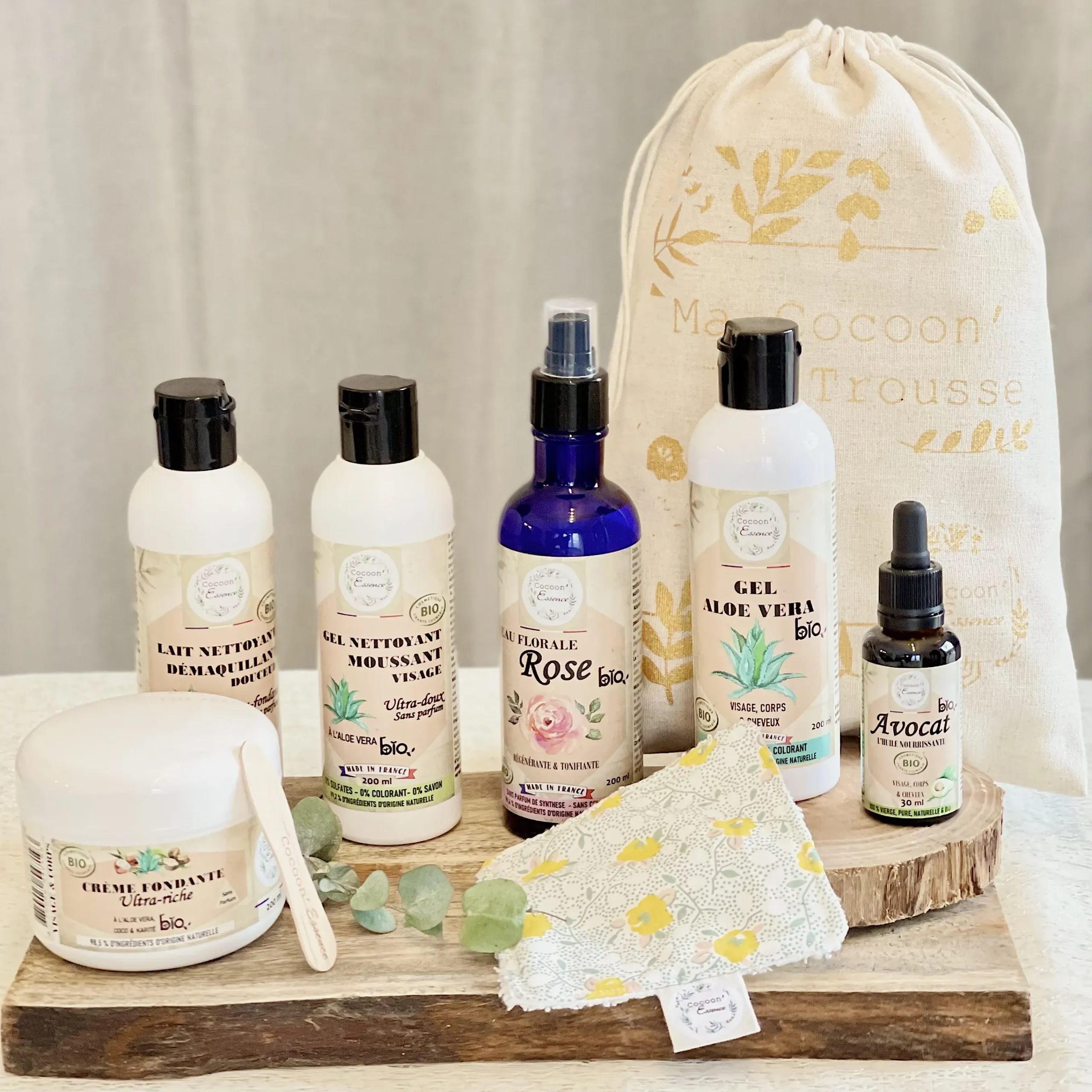 Dans son joli pochon Lin, notre Cocoon’Trousse Routine Peaux Sèches vous offre vos soins essentiels de beauté Bio et naturels pour nettoyer, nourrir, hydrater et protèger votre peau sèche au quotidien. Une routine complète simple, sans parfum, sans huiles essentielles, sans produits superflus, pour une peau saine au naturel.