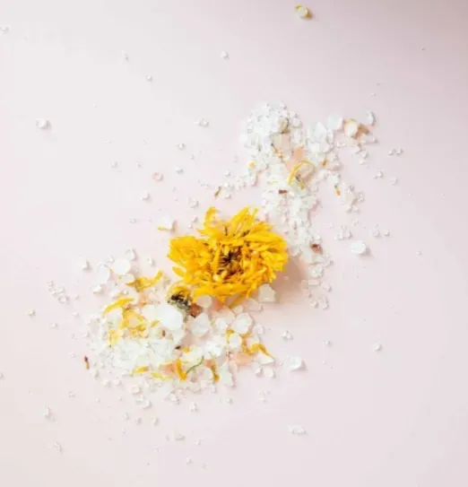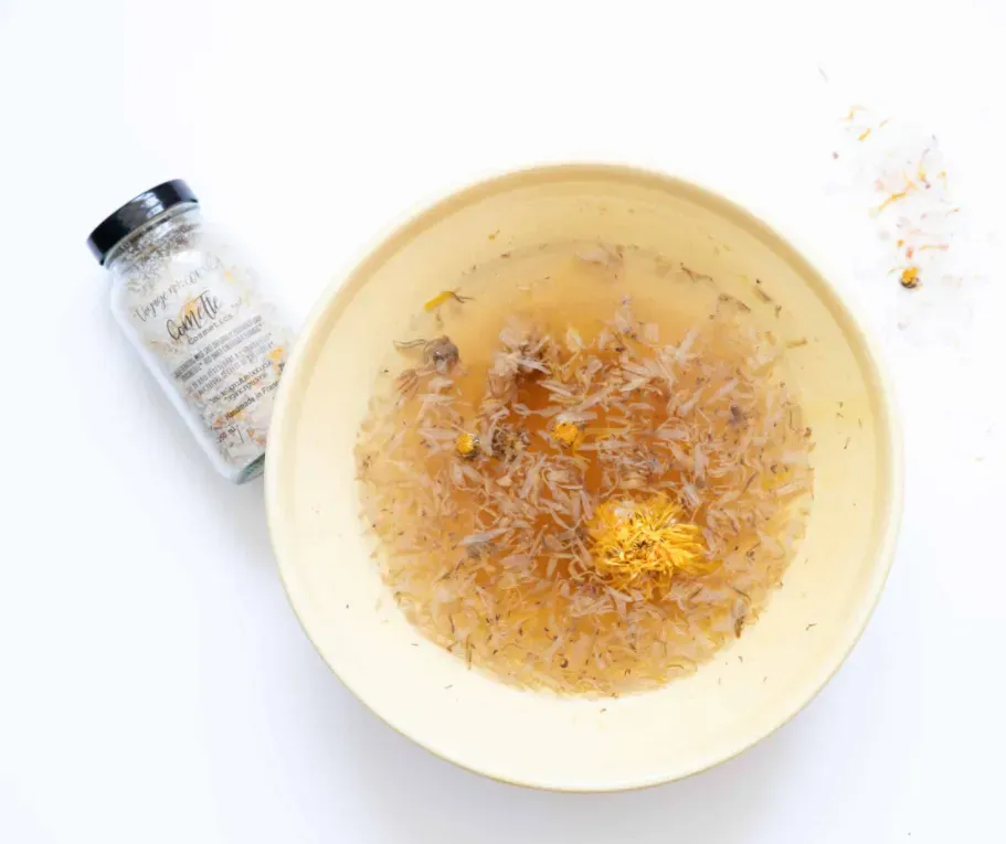Sel d’epsom, sel de la mer morte, fleurs séchées de calendula biologiques, huile essentielle d’helichryse italienne biologique (immortelle).