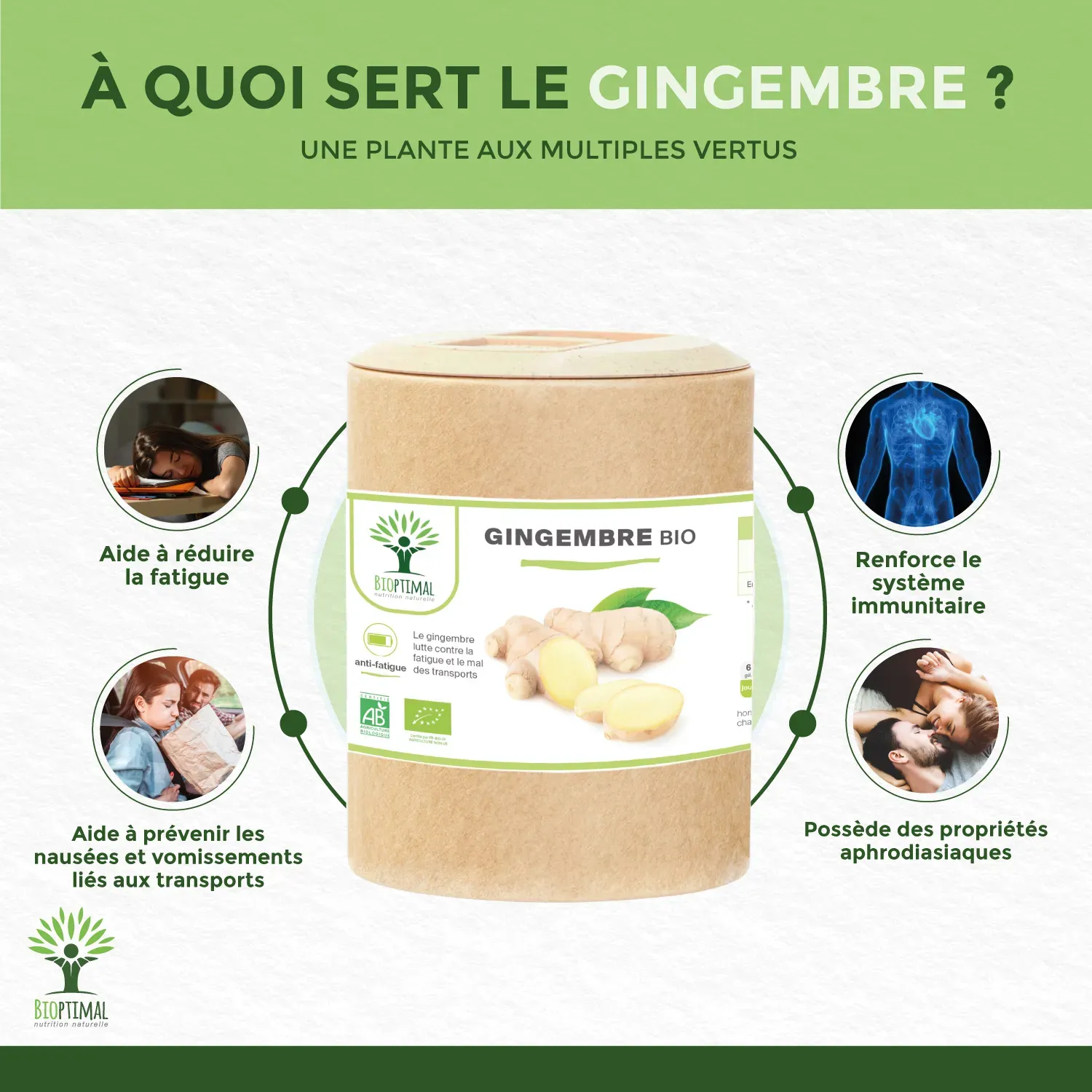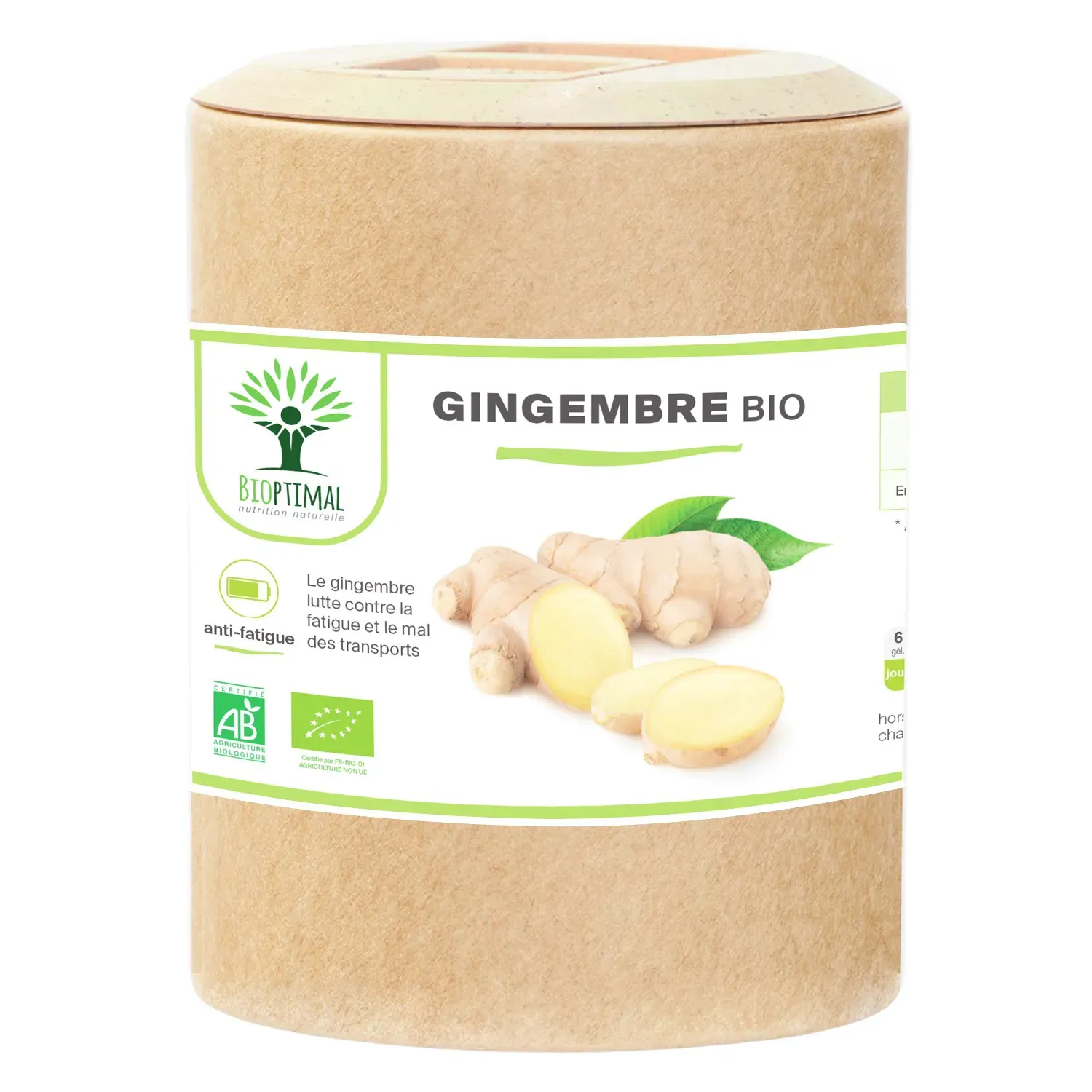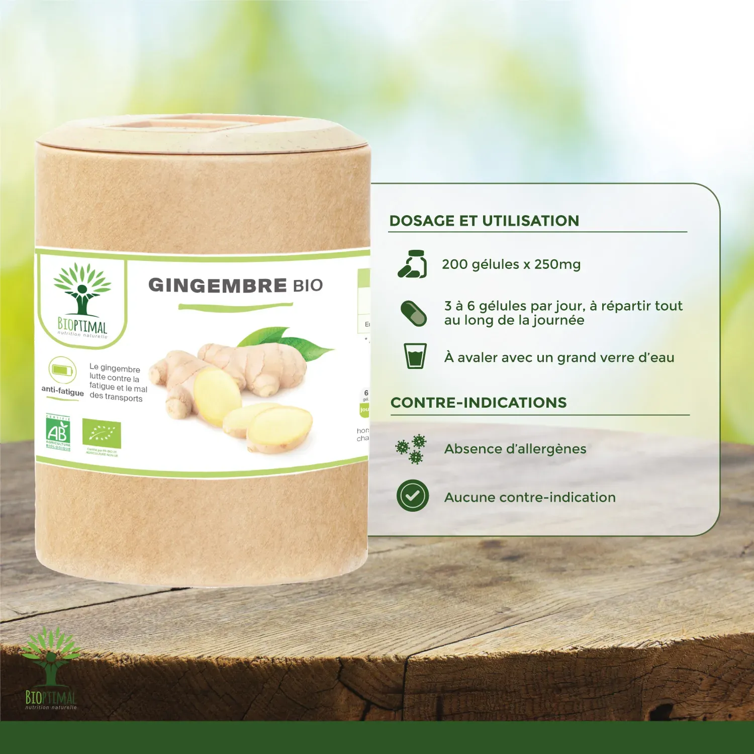 Notre produit Bioptimal nutrition naturelle : Ingrédients, Racines de Gingembre biologiques de qualité supérieure. Garantie sans additif. Nous avons choisi de vous proposer un format gélule végétale plus efficace que le thé, la tisane, l’infusion ou l’huile et plus simple à intégrer à votre alimentation avec une assimilation plus rapide. Dosage 270mg / capsule. 2 x 60 gélules = 1 cure de 20 jours. Issu de l’Agriculture Biologique garanti par Ecocert. Adapté aux végétariens et au régime vegan. Fabrication Française en Bretagne. Emballage recyclable et biodégradable. Attention aux produits concurrents qui utilisent des additifs pour être compacté en comprimé.