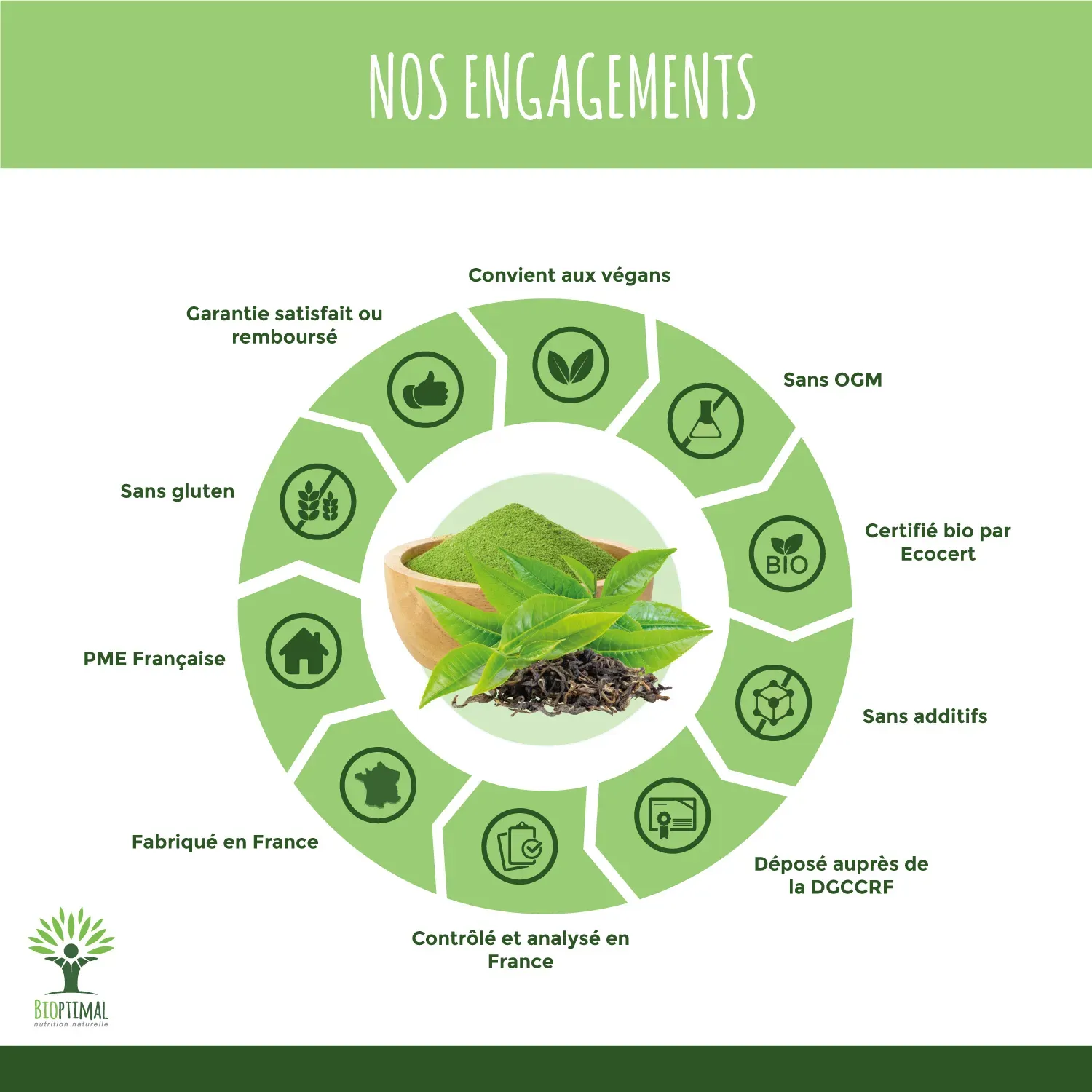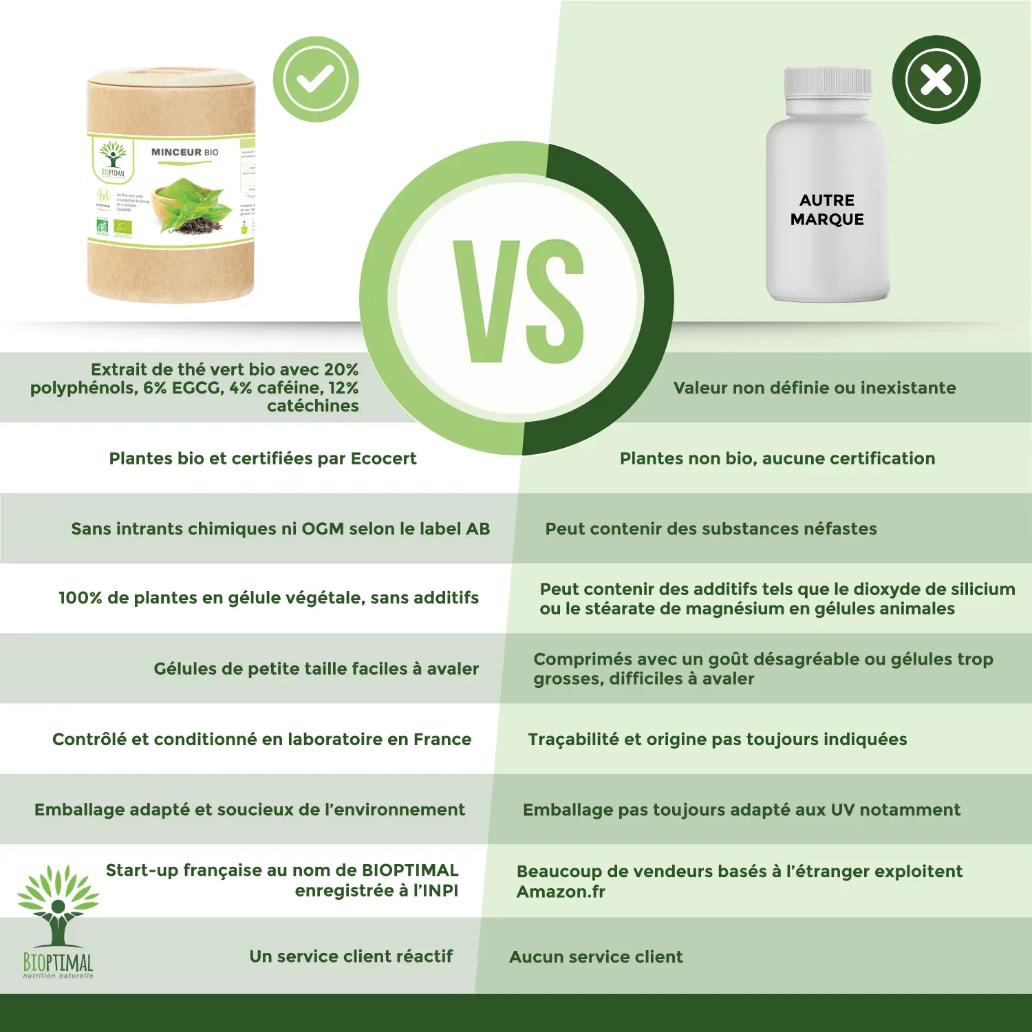 Notre produit Bioptimal nutrition naturelle : Ingrédients, Extrait de thé vert (Camélia Sinensis), Guarana (Paullinia Cupana), Extrait d’artichaut (Cynara Scolymus), Ascophyllum. Garantie sans additif. Nous avons choisi de vous proposer un format gélule végétale plus efficace que le thé, tisane ou infusion et plus simple à intégrer à votre alimentation avec une assimilation plus rapide. Dosage 250 mg / capsule. Dose recommandée. 1 boîte de 60 gélules = 1 cure 1/2 mois – 15 jours. Quantité : 60 gélules x 325mg. Adapté aux végétariens et au régime vegan. Compatible avec une diète keto, programme cétogène. Adapté aux femmes et aux hommes. Fabrication Française. Attention aux produits concurrents qui sont souvent ajoutés à du dextrose pour est compacté en comprimé. Produits déclarés auprès de la DGCCRF